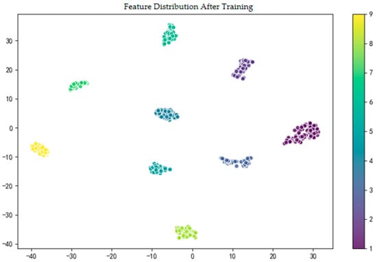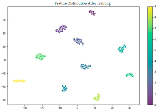 As shown in Table 6, the proposed model in this paper achieves the highest identification accuracy in the comparison, which indicates that its architecture possesses efficient feature extraction ability. To intuitively demonstrate the model’s feature discrimination effect, the t-SNE algorithm is used to perform dimensionality reduction and visualization on the extracted deep features.