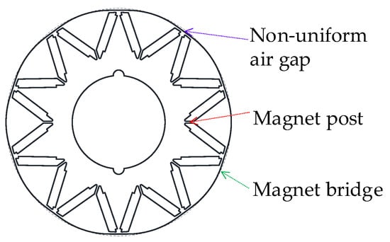A notable constraint inherent to the V-type rotor topology is the magnetic flux leakage occurring in the magnet post and bridge regions, as illustrated in Figure 2. Minimizing this flux leakage is essential to improve flux concentration and enhance torque output. Simultaneously, it is imperative to maintain rotor structural integrity against failure induced by centrifugal forces and stress concentrations. Additionally, the rotor periphery is engineered with a non-concentric arc profile to create a non-uniform air gap, which serves to improve the sinusoidal quality of the back-electromotive force and reduce the cogging of the torque.