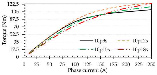 As previously mentioned, the four variants are designed to have identical flux densities in both stator teeth and yoke. Consequently, the slot number z is the primary factor influencing torque output and overload capacity. Figure 4 presents the torque–current characteristics for 10p9s to 10p18s, obtained through parametric FEM. In the FEM, periodic boundary conditions were applied to reduce the model size. Specifically, the 10p12s and 10p18s employ half-models with anti-periodic boundary conditions, while the 10p15s model utilizes a one-fifth segment with periodic boundary conditions. In contrast, the 10p9s model, which lacks periodicity, uses the full geometry. For mesh generation, the circumferential step in the air gap was set to 1/90 of the arc length, corresponding to one electrical cycle. The stator and rotor components are meshed using a fixed element size. As for solution process, the convergence tolerance is set to 0.002.