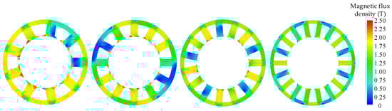 However, the behavior differs significantly when operating under high current conditions that drive the stator core into magnetic saturation. A critical observation is that the torque constant progressively decreases as the current increases, attributable to the intensified effects of magnetic saturation. Notably, 10p12s and 10p18s generate nearly identical overload torque at the peak current of 250 A, both exceeding that of 10p9s. This suggests that the anti-saturation performance of 10p18s surpasses that of both 10p9s and 10p12s, despite its rated torque constant being lower than that of 10p12s. Figure 5 illustrates the magnetic flux density under a torque overload condition, when one of three-phase current reaches its peak value, revealing that the flux densities in the stator tooth and yoke are lower for 10p15s and 10p18s compared to 10p9s and 10p12s. The primary reason for the reduced magnetic saturation is the more distributed arrangement of phase coils. For instance, unlike the concentrated grouping of three coils in the 10p9s configuration, as visually confirmed in Figure 3a, the phase coils in other combinations are more widely dispersed within the stator core. This finding indicates that strategically increasing the slot number can provide a significant advantage, thereby improving the machine’s operational performance and its capacity to handle torque overload conditions.