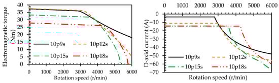 Figure 6 illustrates the torque–speed characteristics and the corresponding d-axis current required for all four machines when operated at their rated current, where the result is calculated using FEM. The data reveal that the flux-weakening performance is strongly dependent on the speed range of operation. Below the critical speed, the 10p9s, followed by the 10p12s, exhibits the broadest torque–speed envelope, indicating the most superior flux-weakening capability. The 10p12s demonstrates enhanced torque generation throughout the operational range from the critical speed up to 3850 r/min. Furthermore, within the narrow speed interval of 4400 to 5250 r/min, the 10p18s shows a marked advantage in torque production compared to the 10p12s. Examination of the current requirements of the d-axis indicates that the 10p15s and 10p18s are most efficient in the mid-speed range of 3000 r/min~4500 r/min. At higher speeds, up to 4750 r/min, the 10p18s emerges as the most efficient, while the 10p12s consistently requires a moderate level of weakening current across the entire speed spectrum.