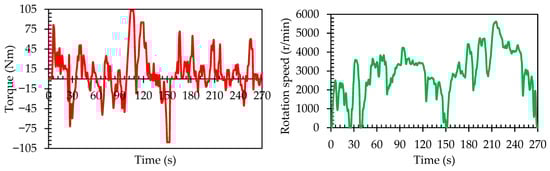 The preceding analysis demonstrates that each slot number candidate exhibits unique performance trade-offs concerning torque output, torque overloading, and flux-weakening capability, with their respective advantages differing markedly across various speed ranges. For instance, the 10p9s may be selected when prioritizing torque and efficiency at the rated operating point. Conversely, if torque-overloading capability for vehicle start or hill-climbing scenarios are critical, the 10p12s or 10p18s configurations become preferable. However, the 10p9s demonstrates a distinct advantage when flux-weakening capability at 4500 r/min~6000 r/min is highlighted. Therefore, determining an optimal slot number based on a limited set of operating points is not rational; instead, a thorough evaluation aligned with the motor’s actual operational duty cycle is required. This section assesses the performance of each motor under a specified driving duty cycle to ascertain its overall operational efficiency. Figure 7 illustrates the motor speed and torque demands over entire duty cycle time, derived from modeling parameters including vehicle speed, mass, frontal area, wheel radius, drag coefficient, gear ratio, and rolling resistance coefficient, as recorded in Table 3. The data indicate that the motor operates across a range of speeds and torques within its maximum speed and power constraints, rather than at constant values. Additionally, it is key to note that during regenerative braking phases, the drive motor acts as a generator, supplying electrical energy back to the battery.
