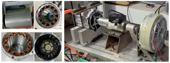 To validate the preceding analysis, motor prototypes featuring different slot numbers were manufactured, all utilizing a single shared 10-pole rotor, as shown in Figure 9. The motor employs a cooling system with housing fins, which facilitate forced air convection as airflow passes over the surface during vehicle operation. To improve thermal dissipation, the windings were impregnated with an epoxy resin compound. A test platform was developed, consisting of a motor coupled in a back-to-back arrangement with a powder brake. This test bench is intended to replicate the dynamic conditions of an actual driving cycle. The powder brake’s input current was modulated to achieve the desired torque profile, while the drive machine was controlled according to the specified speed trajectory of the duty cycle, keeping the mechanical power of all four motors identical.