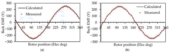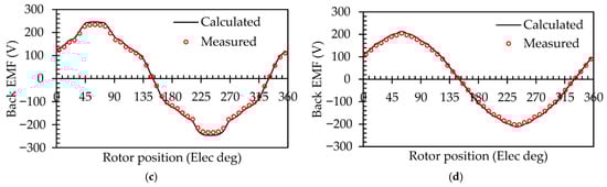 Table 5 provides a comparative evaluation of the calculated and experimentally measured inductances and back-EMFs. The data indicate that the measured inductance is marginally higher than the calculated one, with the maximum deviation remaining under 3%. This slight discrepancy is likely attributable to stray inductance arising from coil interconnections and the terminal lines of each phase.