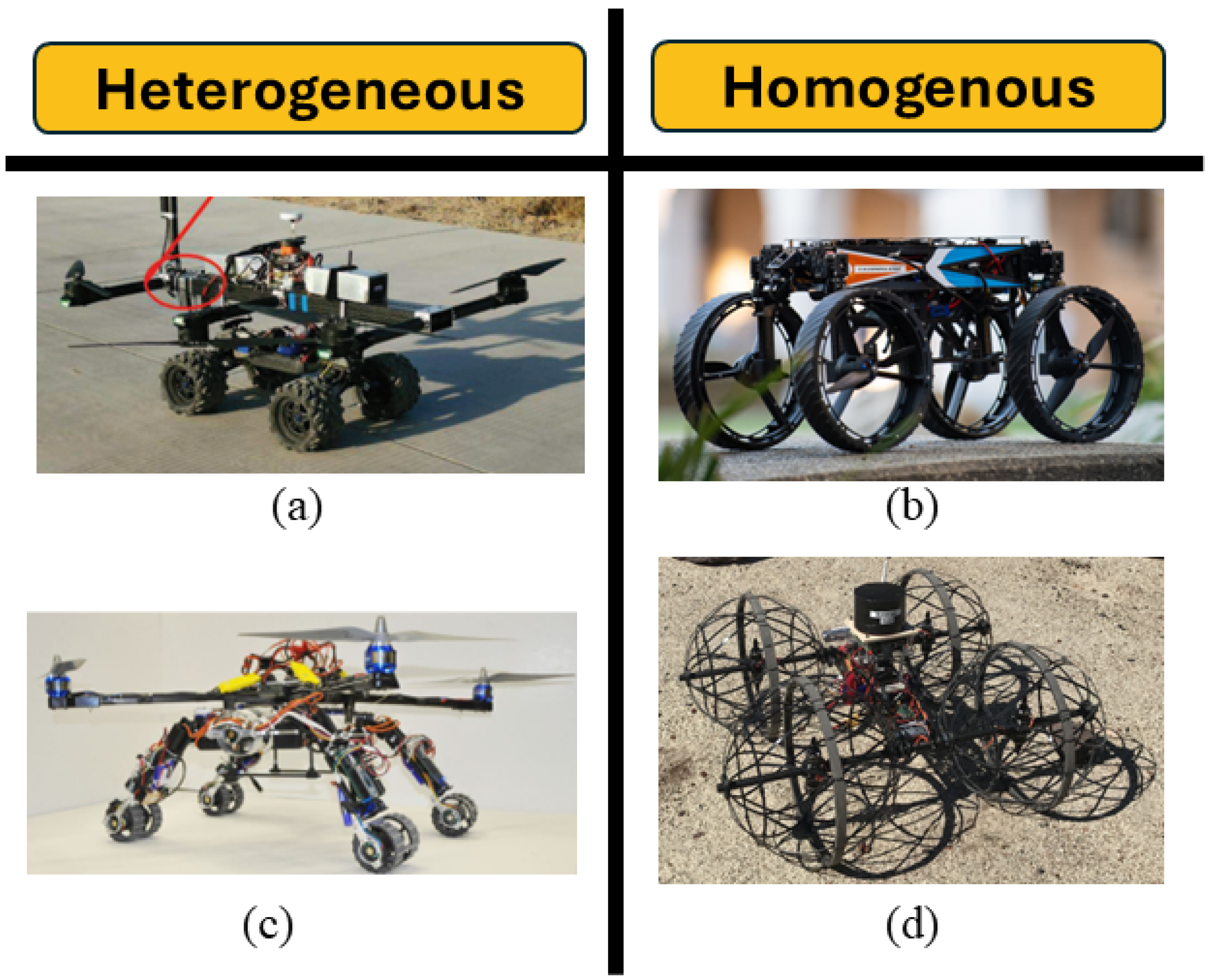 Figure 3. Comparison of homogeneous and heterogeneous multimodal, including (a) AGAR [20], (b) M4 [24], (c) H.E.R.A.L.D [19], and (d) Drivocopter [18].