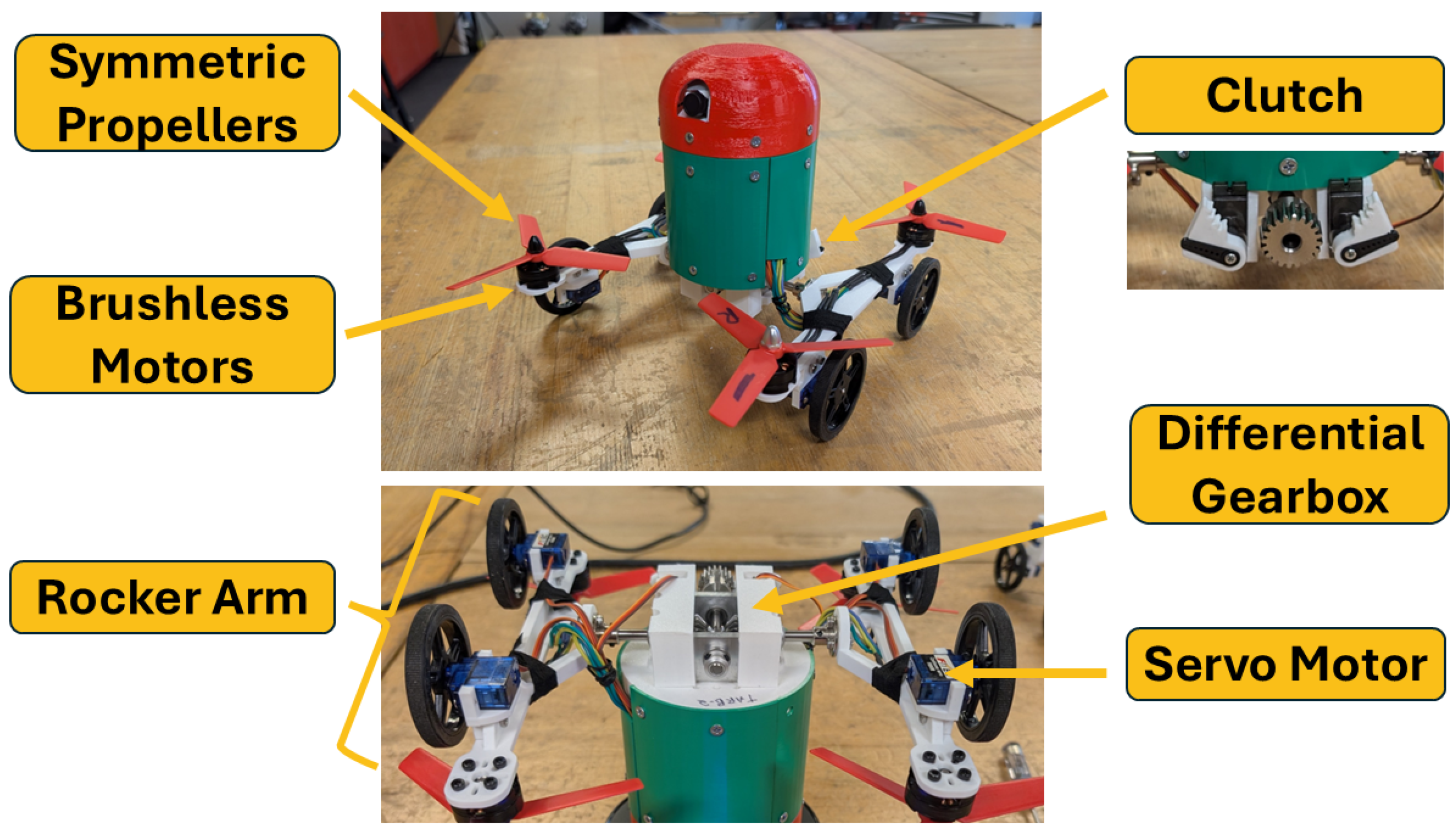 By employing some significant lessons learned from the heterogeneous designs, the homogeneous design made a number of key improvements. Firstly, this approach significantly lowered the center of gravity for the CanBot to improve the general stability of the model. Second, the homogeneous design was still largely informed from the creation of separate monomodal CanBots, but the mechanics for those robots were fused to create single homogeneous mobility designs. The fusion of the rocker-bogie and quadrotor concepts was completed by mounting the thrust-generating propellers directly on the ends of the rocker arms. This created a system where the propellers were fixed directly to and located in close proximity with the wheels of the rocker bogie. To maintain enough clearance for the spinning propellers, the rocker arms were also flattened significantly and mechanically coupled using a differential gearbox instead of the sequence of control arms. The differential gearbox-based rocker-bogie approach is more commonly utilized for planetary surface-exploring robots and was first trialed as a discrete mechanism in another CanBot featured in Figure 6.