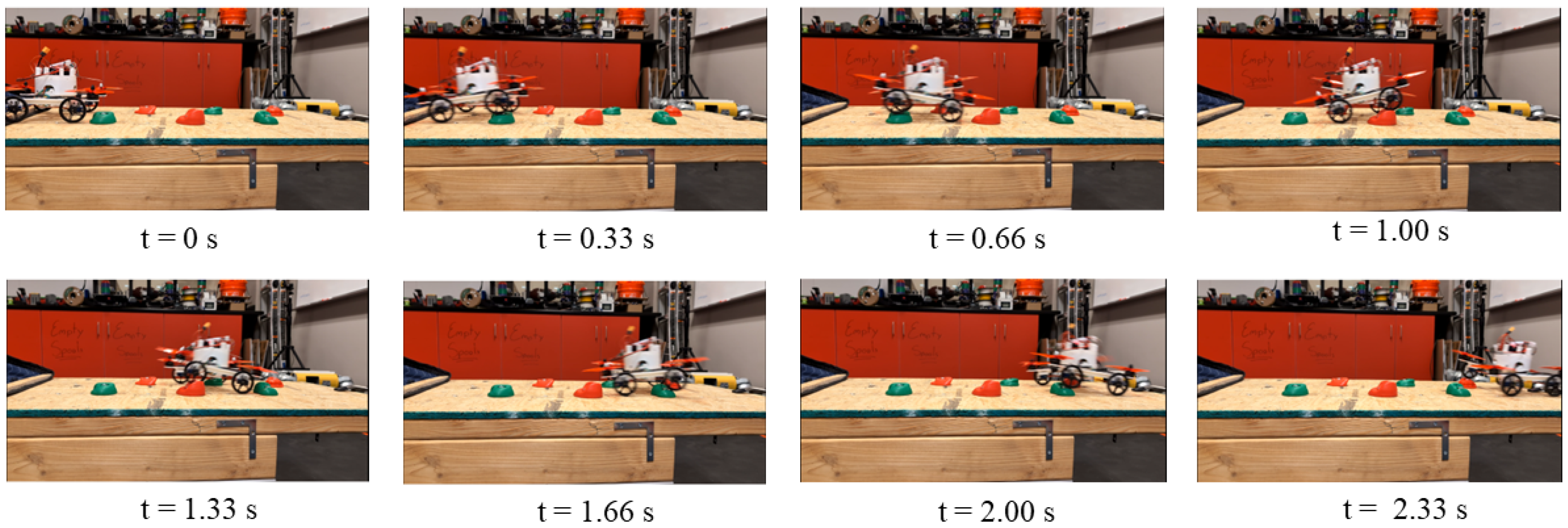 To demonstrate both terrestrial and aerial mobility, first, the ATAT table was fitted with artificial rocks and TARB was tested with the differential clutch unlocked and the table in a level position. These tests, illustrated in Figure 11, showed that the rocker-bogie mechanisms operated as expected and allowed the vehicle to terrestrially traverse obstacles of a significant size. Aerial validation of the TARB was completed in a safe and controlled laboratory environment where the differential clutch was first locked and then the onboard FC set to a standard quadrotor flight profile. These tests indicated that the system was able to successfully hover and maneuver as a multirotor vehicle. Combined motion tests were also undertaken where the TARB was first driven terrestrially, then remotely reconfigured for flight mode to allow the rover to overcome very large obstacles [35]. These trials indicated that the system was capable of demonstrating chained actions, moving between terrestrial, aerial, and hybrid modes without the need for external modification.