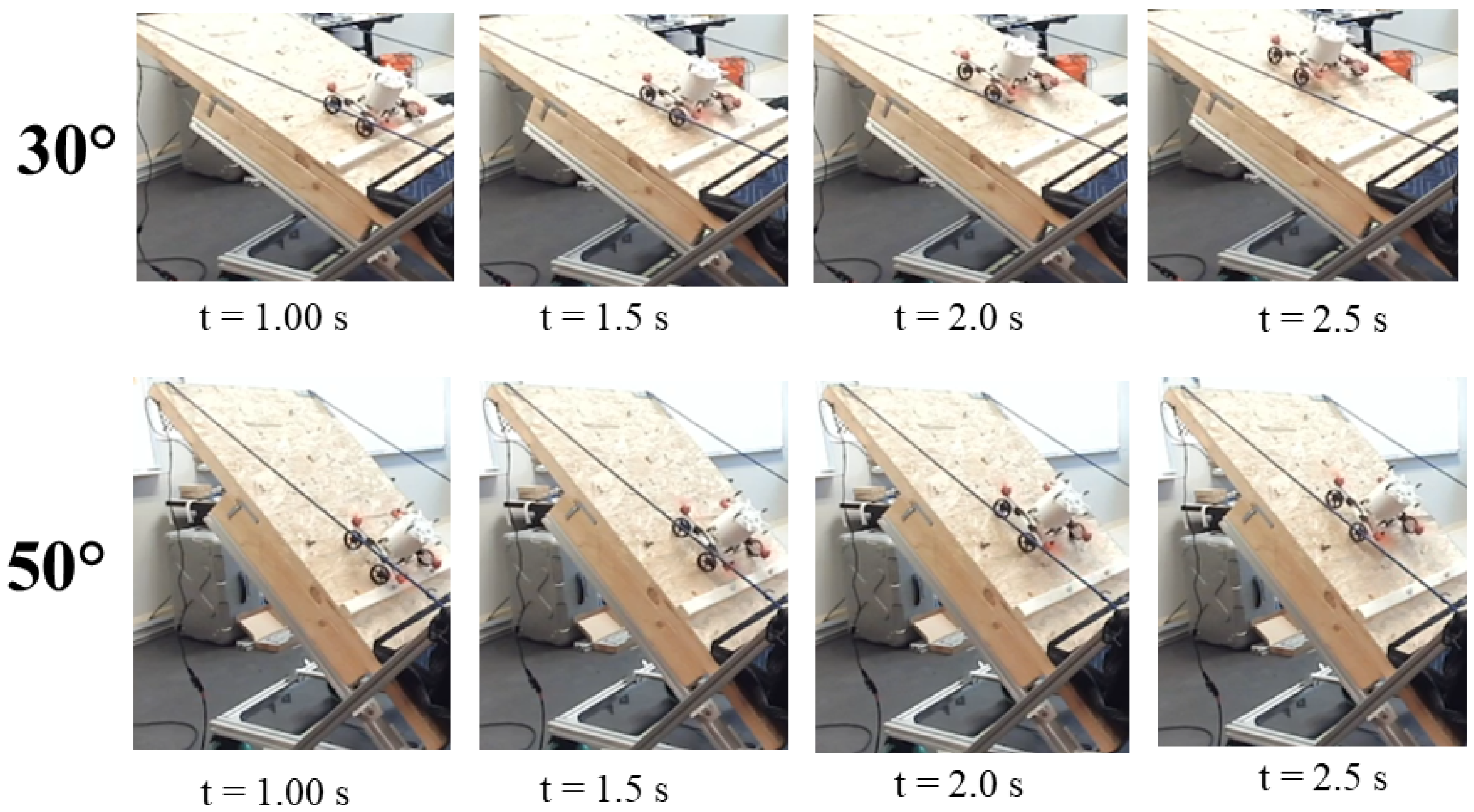 Raw trajectory data for this CanBot is presented in Figure 9, while the computed wheel slippage for the rover is compiled in Figure 10. The first five test runs featured in these figures included inclines of between zero and approximately twenty degrees. For these tests, the heterogeneous rocker-bogie CanBot was able to climb the surface of the ATAT table without any thrust augmentation. These initial test runs are plotted as blue lines. Notably, based on the estimated center of gravity for the CanBot and the computed support polygon, the vehicle was expected to loose static stability at approximately 30 degrees of incline. However, the experimental testing found that the dynamic stability of the system became compromised at inclines exceeding approximately 20 degrees. Beyond that threshold of dynamic stability, the propellers were engaged with the thrust pointing away from the surface of the table so as to push the CanBot onto the surface. Trajectories of the heterogeneous CanBot design with the propeller augmentation engaged have been plotted in red for both figures. With this augmentation, the CanBot was able to continue to climb the slope beyond the point of static instability, reaching a maximum climbing angle of approximately 40 degrees. Figure 10 correlates the slope angle with the percent slippage of the wheels. Notably, the slippage percent increased regularly from zero to twenty degrees before suddenly decreasing as the thrust augmentation was engaged. Table A1 summarizes the results from both plots and indicates the measured travel distance of the CanBots and the mechanisms for determining the climbing angle.