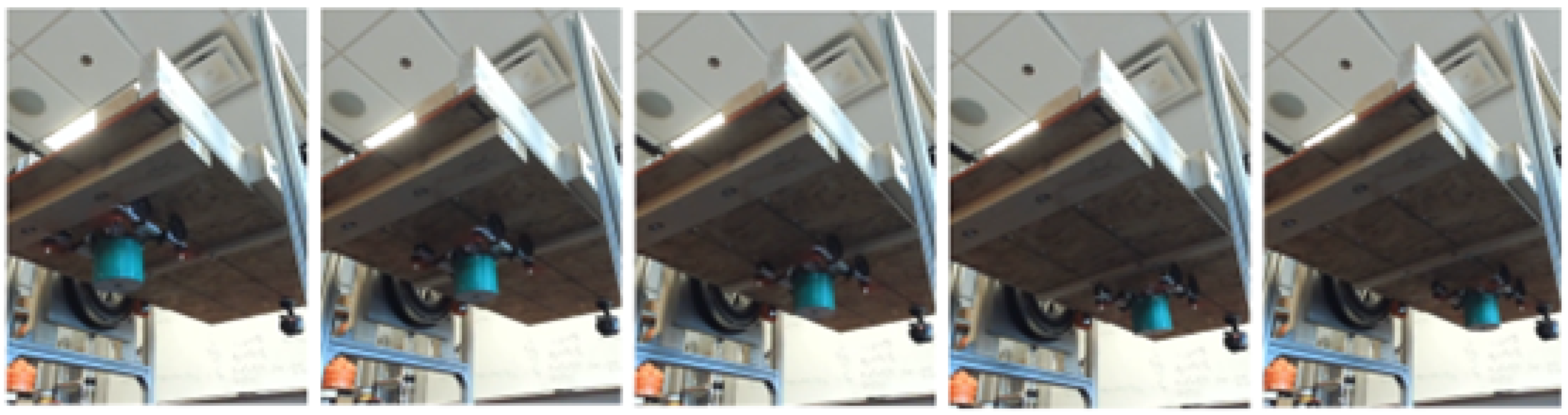 In addition to the ATAT-Table incline testing described later and featured in Figure 12, the final and most extreme mobility validation for the TARB involved fully inverting the vehicle with the thrust augmentation active. In this test, the homogeneous TARB demonstrated the capacity to stay adhered to the moving surface of the improved ATAT table to the point of complete inversion of the CanBot. Figure 13 displays an image sequence of the TARB successfully moving along the inverted surface of the ATAT table. In this mobility demonstration, the TARB was also successful in overcoming a small obstacle attached to the surface of the inverted table. This demonstration showed the unique mobility capacity of the TARB to engage inverted wheeled operation, with the rocker-bogie system operating successfully to facilitate rolling over obstacles. Additional inverted trials for the TARB design can be found in [35].