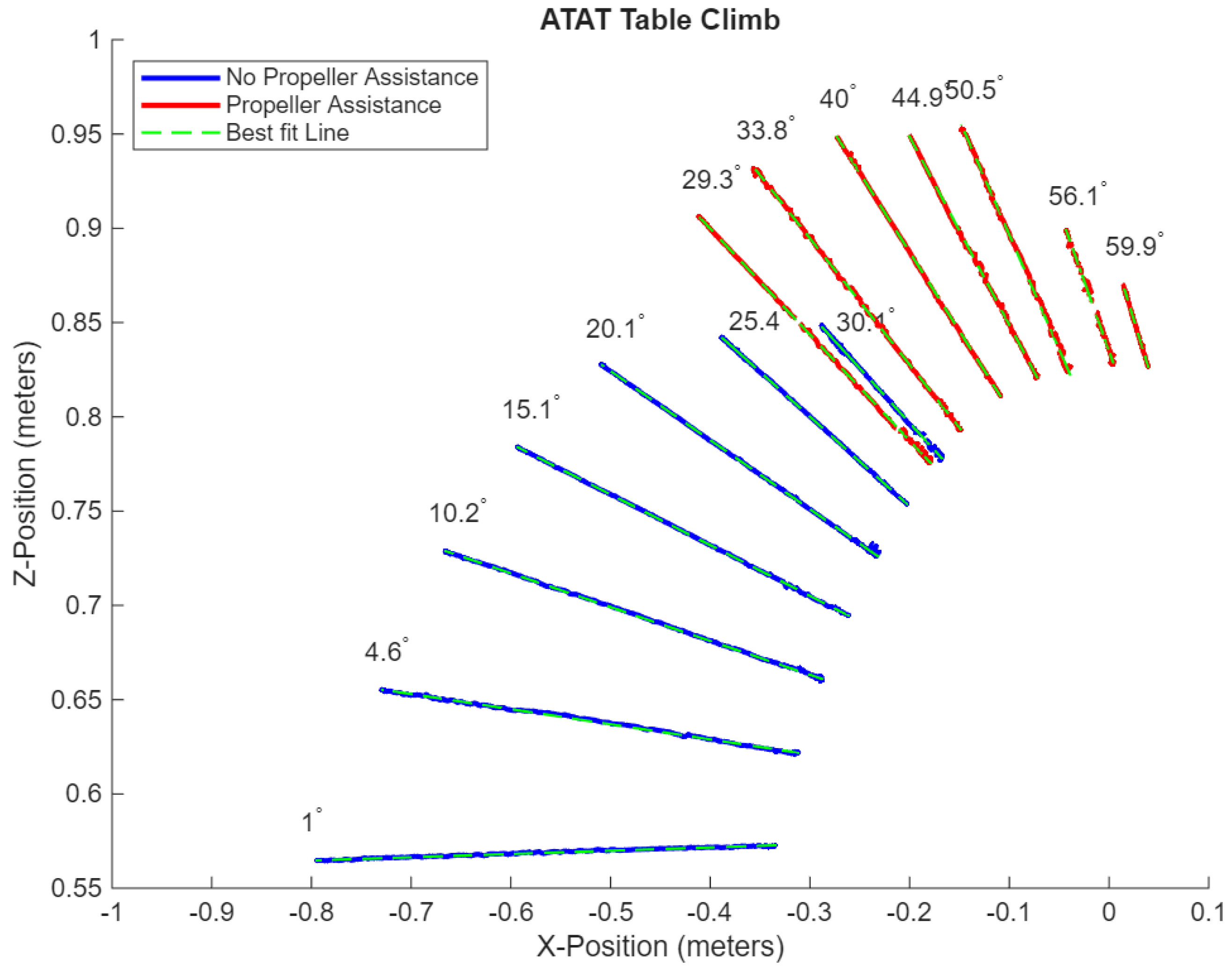 Incline testing of the homogeneous TARB followed the same general experimental approach as the heterogeneous system, as shown in Figure 12, where an image sequence of the TARB climbing the ATAT table is included. The trajectory data measured for the TARB-equipped CanBot is compiled in Figure 14. With the homogeneous design, the CanBot was able to climb a slope in excess of thirty degrees without requiring the addition of the thrust augmentation. Notably, once the thrust argumentation was engaged, the slippage rate at a slope of thirty degrees was greatly decreased from approximately 80 percent to around 40 percent. As before, the blue lines represent data collected without thrust augmentation, while the red lines represent tests where the propellers were active. With the addition of the thrust augmentation, the CanBot was able to further climb slopes of up to 60 degrees and was able to still maintain contact with the sloped surface up to inclines of 90 degrees. However, at the maximum incline of 90 degrees, the CanBot was unable to successfully climb the surface of the table.