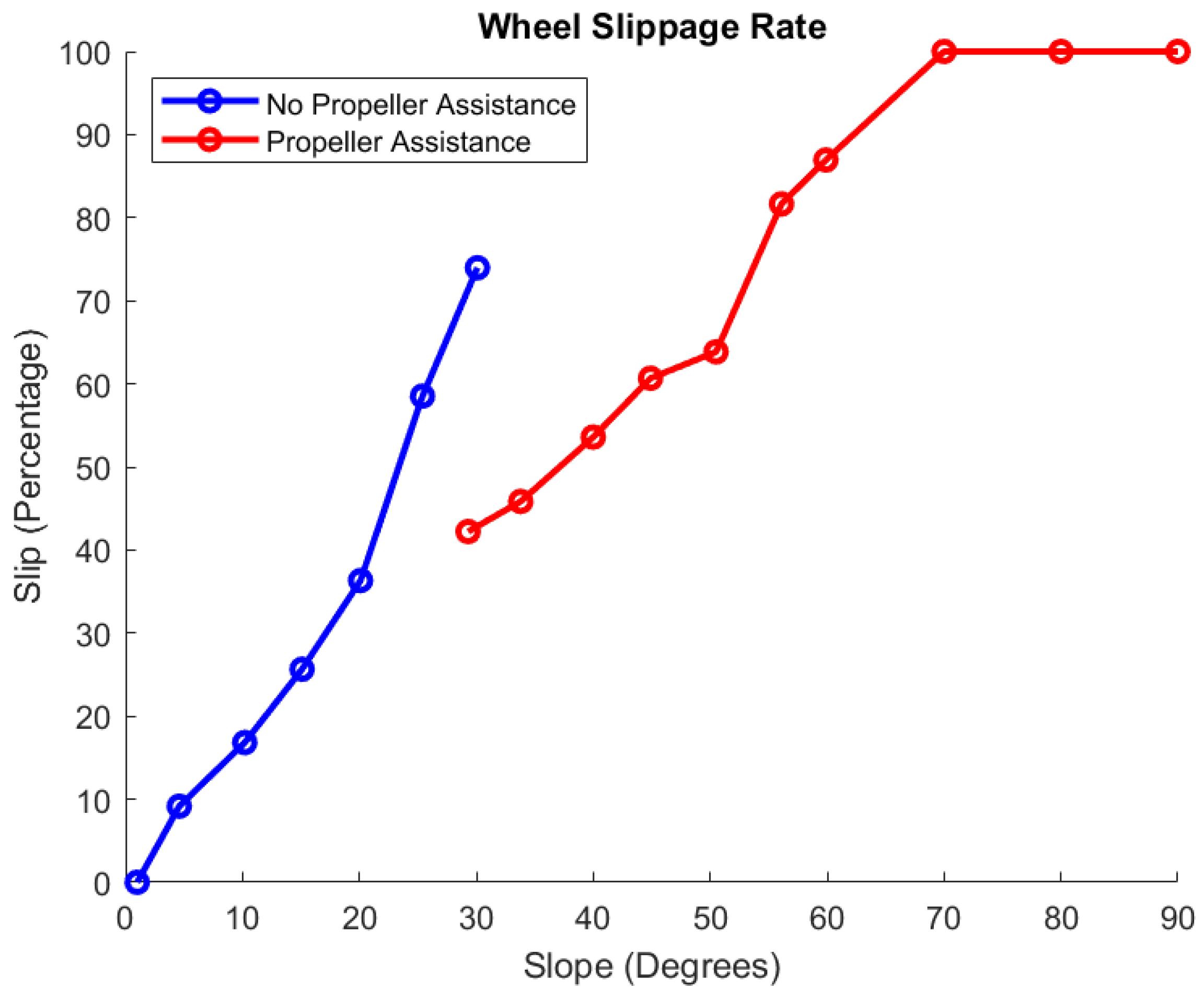Wheel slippage as a function of an inclined slope was identified as a preferable means for quantifying mobility effectiveness. This quantification technique has been previously utilized for wheeled planetary surface rovers from the Mars Exploration Rovers (MERs) [36] to more modern systems such as the Mars Science Laboratory (MSL) [37].