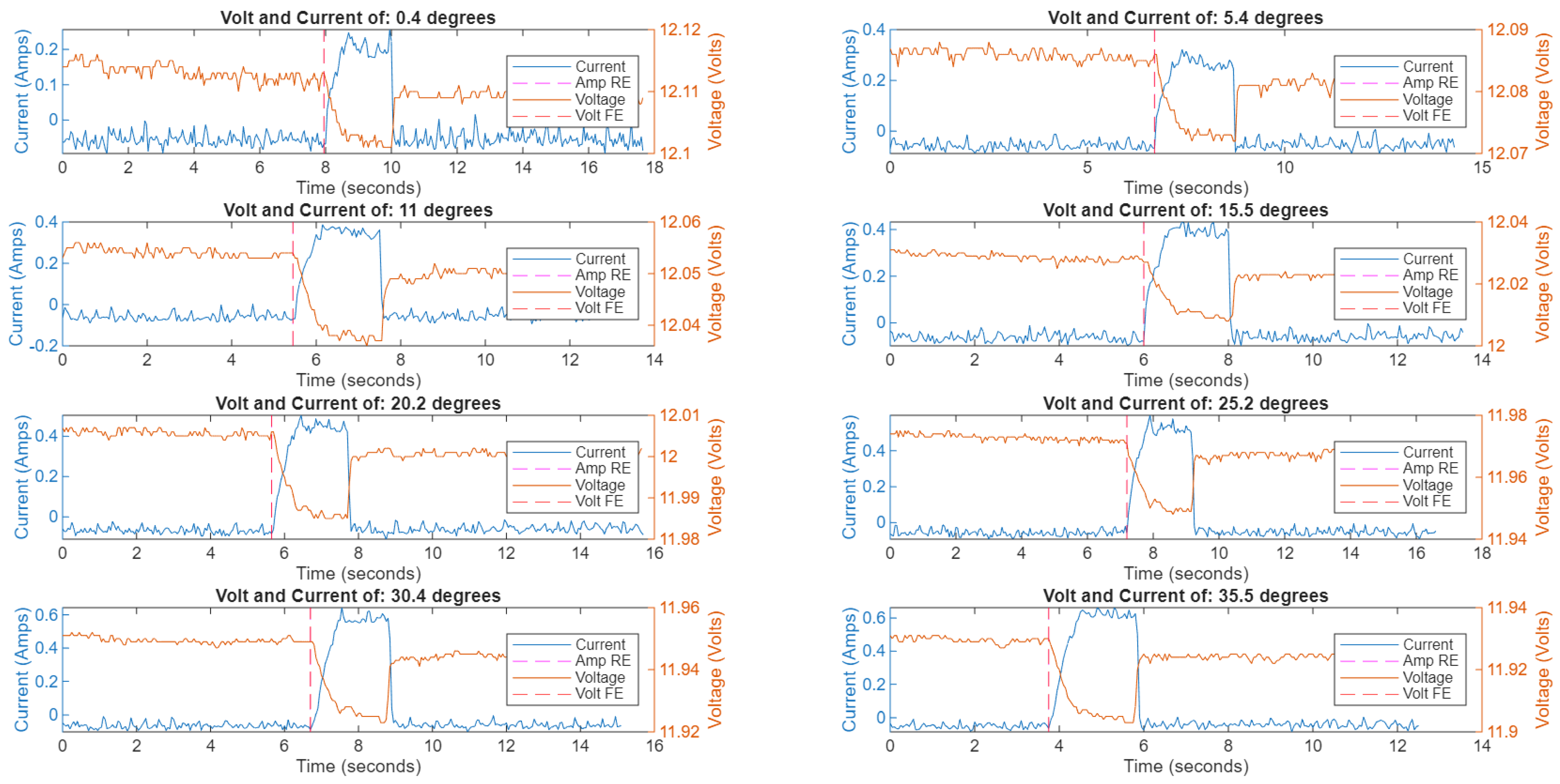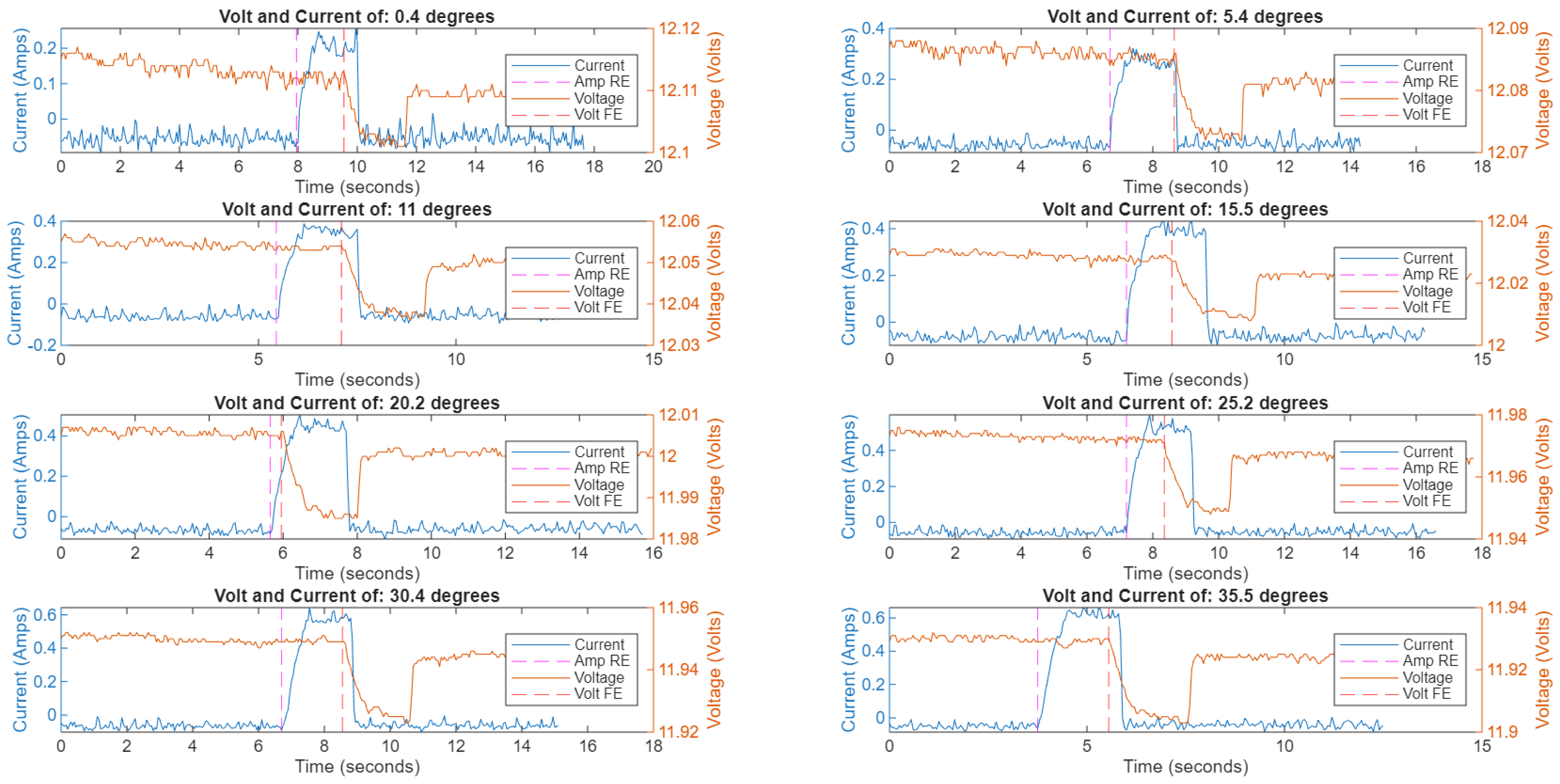 As with the previous incline testing, the CanBot was programmed to drive a set distance along the surface of the ATAT table. For the first battery of tests, the propellers remained deactivated, with the robot moving only in the terrestrial mobility mode. The surface of the table was inclined between each test, providing a gradually increasing slope that the robot was directed to climb using the maximum wheel speed it was capable of. The voltage and current data generated by this experimental process is included in Figure 16, with the voltage plotted as the orange lines and the current as the blue. Notably, there was a small lag noted between the Rising Edge (RE) of the current and Falling Edge (FE) of the voltage. As Ohm’s law would predict that these events should be correlated, for an assumed constant resistance of the motors, the RE and FE were tagged in the data and synchronized, as featured in Figure 17. Once the voltage and current data was successfully resynchronized, the power consumption for the CanBot could be computed for each level of incline as depicted in Figure 18. In this figure, the red boxes mark the period of time when the CanBot was climbing the surface of the table. As would be expected, the increased degree of inclination resulted in greater power consumption. This data was also used to determine how much power the CanBot required while not actively climbing the incline, as marked with the blue boxes.