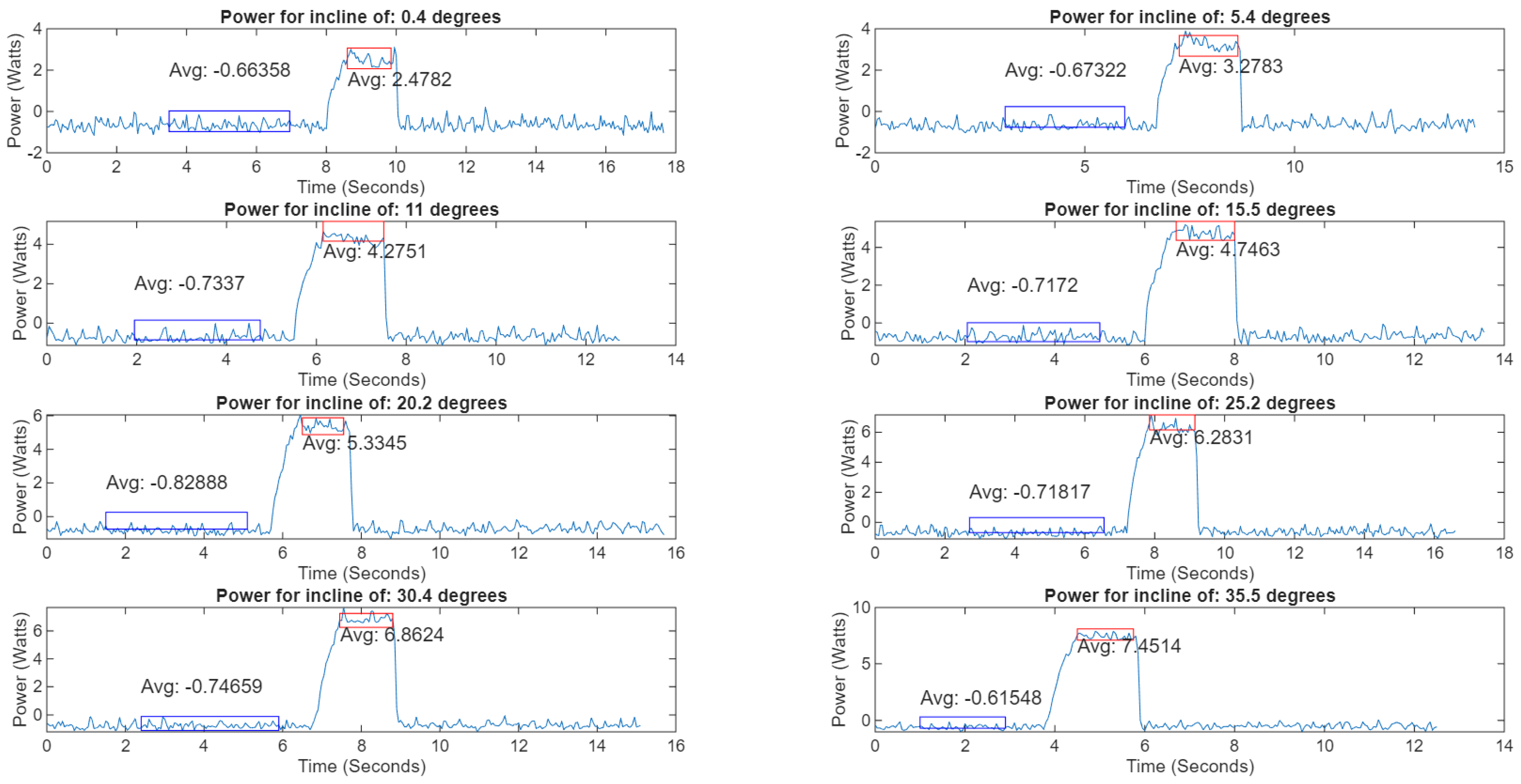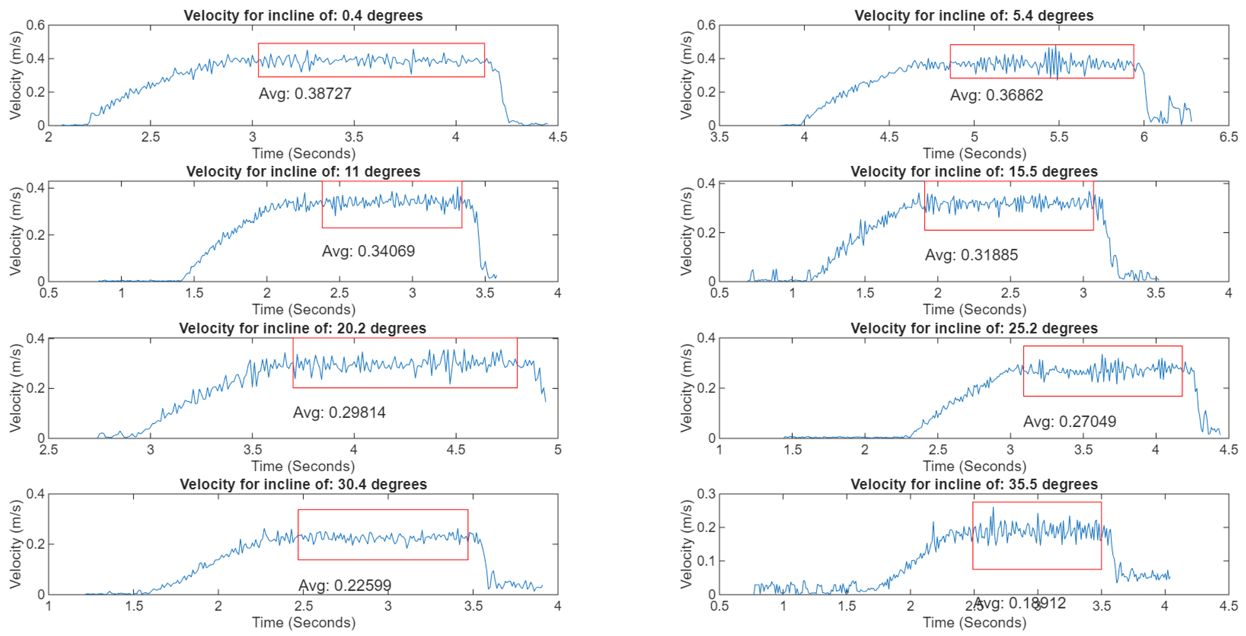 In conjunction with the power logging equipment, the MoCap system was also utilized during these tests to record the position of the CanBot. This data was leveraged to determine a more accurate value for the angle climbed, as with the previous test, but the derivative of the positional data was also computed to ascertain the velocity of the vehicle during the climb. This instantaneous velocity data is presented in Figure 19 for each level of incline tested. For each climb test, the CanBot was allowed to reach a constant climbing velocity, which has been identified with the red boxes on each of the plots. Averaging this constant velocity section of the CanBot’s climbing data provided a means for computing the Cost of Transport (COT) for the CanBot in conjunction with the previously established power data. Since COT provides a means for comparing the energy required to move a mass at some speed, it was a convenient measure of efficiency for the CanBot. The following equation was used to determine the COT:
