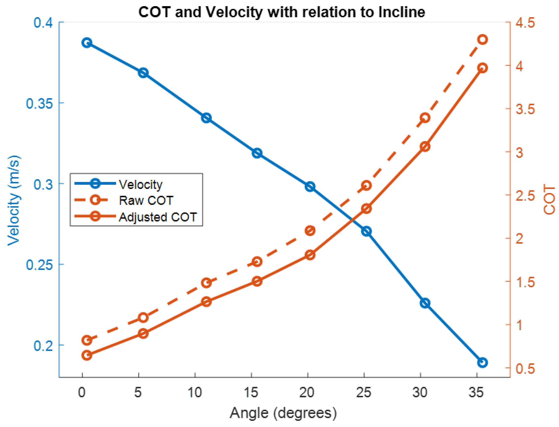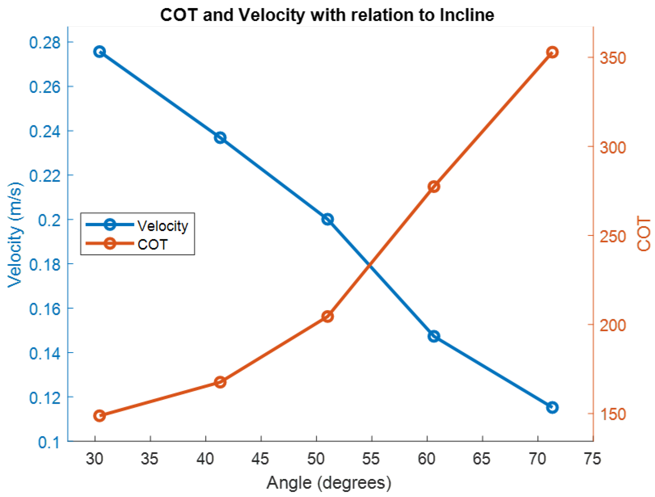 Figure 20. Comparison of velocity and COT for different inclines for the homogeneous TARB without thrust augmentation [8].
