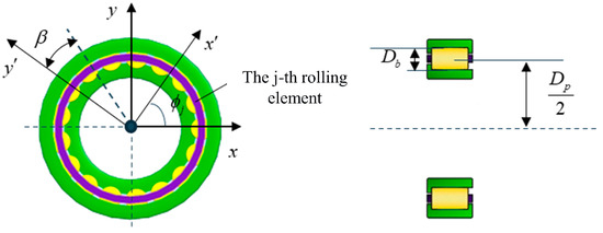 in the above equation, is the Hertzian contact stiffness; is the total compressive contact deformation of the rolling elements, and are the displacement components in the and directions, respectively, and is the angular position of the -th rolling element.