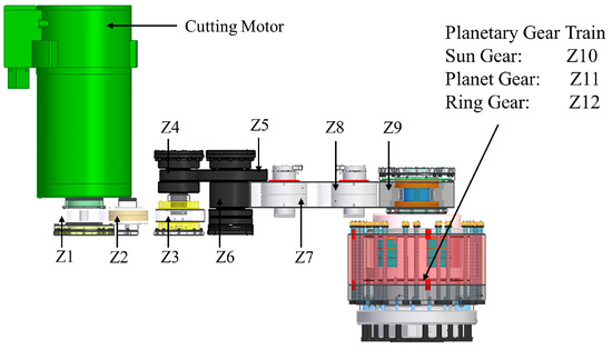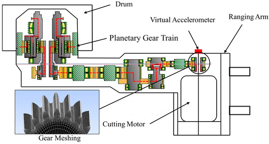 Based on the transmission system model of a conventional drum shearer’s cutting unit and incorporating the operational characteristics specific to bauxite mining, a three-dimensional gear transmission model for the cutting unit of bauxite mining equipment was developed, as illustrated in Figure 2. The cutting unit is powered by an 8-pole, 300 kW electric motor. Key geometric parameters of the gears are summarized in Table 1. The gears are fabricated from CrNi-series low-carbon alloy steel and machined to a precision grade of 7.