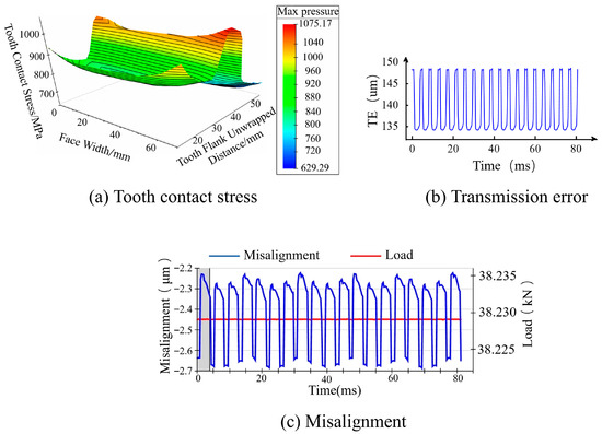 Response curves of tooth contact stress, transmission error, and misalignment for the motor pinion under rated load conditions.