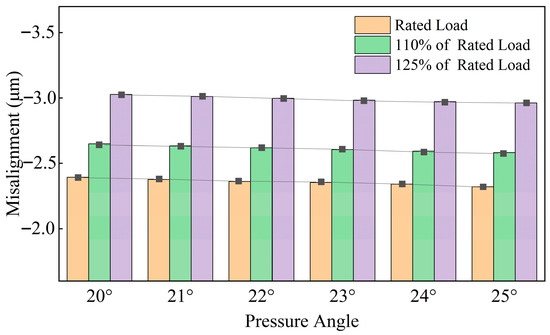 Figure 6 illustrates the average misalignment under different working conditions and pressure angles. As a key negative indicator of dynamic performance, the average misalignment decreases linearly with increasing pressure angle. Under the given conditions, each 1° increase reduces misalignment by approximately 0.015 μm, indicating smoother meshing. At a constant pressure angle, more severe drum loading produces greater misalignment.