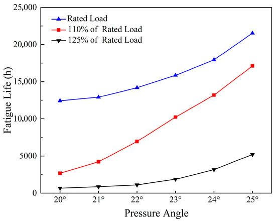 As shown in Figure 8, the fatigue life improves with an increase in pressure angle, though the growth trends vary under different load conditions. Figure 5, Figure 6 and Figure 7 demonstrate that increasing the pressure angle enhances gear meshing performance by reducing both misalignment and transmission error. Under rated load conditions, the system inherently maintains favorable meshing alignment with minimal misalignment. Thus, while increasing the pressure angle improves fatigue life under such conditions, the extent and potential for improvement remain relatively limited. Under 125% rated load, severe system deformation and misalignment significantly constrain the beneficial effect of pressure angle increases on meshing performance, leading to diminished effectiveness of this improvement. In contrast, under 110% load, where increased load exacerbates system deformation and degrades meshing performance, raising the pressure angle proves most effective in optimizing load distribution, mitigating stress concentration, and consequently enhancing fatigue life.