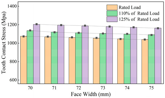 The face width was varied within the range of 70–75 mm to investigate its influence on tooth contact stress, misalignment, transmission error, and fatigue life. Figure 9 shows the tooth contact stress of the motor pinion under different working conditions and face widths.