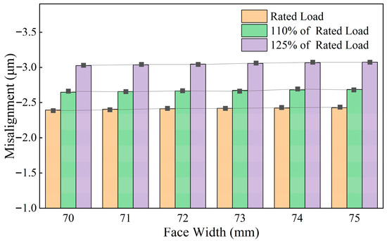 Figure 10 illustrates the misalignment of the high-speed stage gear across different face widths. Misalignment refers to the deviation between the actual meshing position of a gear pair under load and its ideal theoretical meshing position, resulting from elastic deformations of the shaft, bearings, and housing. It is primarily influenced by factors such as axial installation accuracy, bearing axial float, bearing deformation, and housing deformation, rather than geometric parameters like face width. The main role of face width is to enhance the load-carrying capacity and axial contact ratio of gears, without directly altering the misalignment values caused by installation or bearing-related factors. Therefore, changes in face width do not lead to significant variations in the average misalignment.