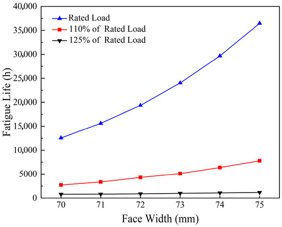 Figure 12 displays the predicted service life of the gear under different working conditions and face widths. As evident from the figure, fatigue life improves with increasing face width. The most rapid increase in fatigue life occurs under nominal (100%) load, followed by the 110% overload condition, while the improvement becomes progressively smaller under 125% overload. This trend highlights the detrimental effect of excessive drum loading on gear durability.