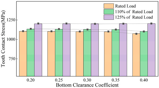 Figure 13 shows the tooth contact stress of the high-speed stage gear under various working conditions and bottom clearance coefficients. Under both 100% and 110% load conditions, increasing the bottom clearance coefficient up to 0.35 results in no significant change in contact stress. However, when the coefficient increases from 0.35 to 0.4, a marked reduction in contact stress is observed. This phenomenon occurs because when the bottom clearance coefficient increases from 0.35 to 0.4, the further raised addendum height significantly reduces the portion of the tooth tip participating in meshing. The contact point distribution shifts from a mixed pattern involving both the tooth flank and tip to one predominantly concentrated in the middle-lower region of the tooth flank. This specific area features a larger radius of curvature of the tooth profile. According to the Hertzian contact stress formula, contact stress is inversely proportional to the square root of the radius of curvature. Consequently, the contact stress undergoes a rapid, step-like decline rather than a gradual nonlinear change. However, under the 125% rated load condition, the substantial increase in load itself far outweighs the stress concentration improvement brought by variations in the bottom clearance coefficient. Moreover, under high loads, the tooth flank contact area becomes fully engaged due to elastic deformation, and increasing the bottom clearance coefficient can no longer alter this state of complete load-bearing contact. Therefore, the contact stress no longer exhibits significant fluctuations with changes in the bottom clearance coefficient.