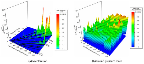 The vibration and noise characteristics of the motor pinion were numerically simulated using MASTA, a nodal finite element-based gear transmission simulation software, to investigate the variation trends of vibration and noise levels with respect to different structural parameters under various operating conditions. Figure 17 presents the acceleration amplitude and sound pressure level responses at a measurement point on the first shaft under 110% load, with a pressure angle of 20°, a face width of 70 mm, and a bottom clearance coefficient of 0.4.