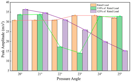 Acceleration response amplitude under different working conditions and different pressure angles.