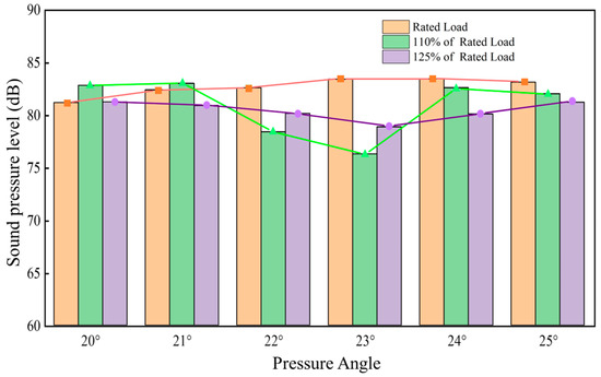A semi-free sound field with a radius of 10 m was configured in MASTA, and A-weighting was applied to the data. Figure 19 displays the maximum sound pressure level responses under different operating conditions and pressure angles. At 100% load, the sound pressure level shows an overall increasing trend with the pressure angle, not exceeding 84 dB. Under 110% and 125% loads, the sound pressure level first decreases and then increases as the pressure angle rises.