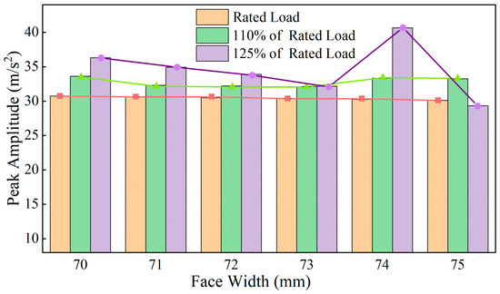 Figure 20 shows the acceleration amplitude response under different face widths. With the exception of the 75 mm face width, the peak acceleration increases with higher drum load torque. Under 100% load, the acceleration amplitude decreases gradually as the face width increases. At 110% load, the amplitude initially decreases when the face width increases from 70 mm to 71 mm; beyond this point, it remains nearly constant, exhibiting only a minor increase (not exceeding 1 m/s2) at 74 mm. Under 125% load, the overall trend shows a clear decreasing pattern, except for a notable spike in acceleration amplitude at 74 mm.
