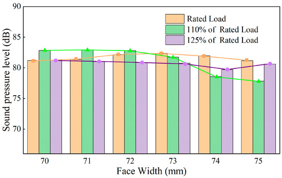 Considering both vibration and noise performance, face widths of 73 mm and 75 mm exhibit favorable reductions in acceleration amplitude. Meanwhile, face widths of 70 mm, 74 mm, and 75 mm each demonstrate distinct advantages in minimizing sound pressure levels across different operating conditions, suggesting that optimal noise control may require condition-specific design choices.