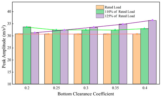 Figure 22 presents the acceleration amplitude under different bottom clearance coefficients. Under 100% load, the acceleration amplitude remains largely unchanged across all coefficient values, with fluctuations limited to within 0.04 m/s2. At 110% load, a noticeably higher acceleration amplitude occurs only at a coefficient of 0.2, while variations at other values are negligible. Under 125% load, the acceleration amplitude increases significantly as the bottom clearance coefficient increases, indicating deteriorating dynamic stability.