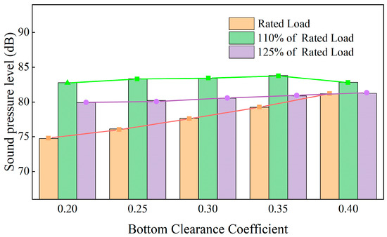 Figure 23 displays the sound pressure level response amplitude under different bottom clearance coefficients. At 100% load, the sound pressure level rises linearly from 74.74 dB to 81.19 dB as the coefficient increases. Under 110% load, the level first increases and then decreases, peaking at a coefficient of 0.35. Under 125% load, the sound pressure level exhibits a gradual upward trend with increasing coefficient.