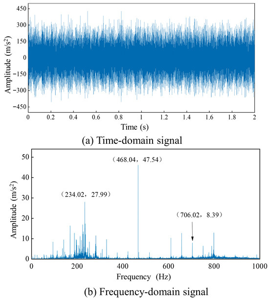 Once the test rig’s ranging arm reached steady-state operation, data were acquired using the DH5925N acquisition instrument equipped with acceleration sensors. A 2 s segment of the vibration acceleration signal was captured and processed via Fourier transform to obtain the acceleration response under 110% load before the improvement, as illustrated in Figure 25. Figure 25a presents the time-domain waveform of the acceleration signal, while Figure 25b displays the corresponding frequency spectrum. The three dominant peaks in the spectrum correspond to the first, second, and third harmonics of the meshing frequency of the high-speed gear pair. The frequency with the highest amplitude is 468.04 Hz, which aligns precisely with the second harmonic of the first-stage gear pair meshing frequency. This observation shows excellent agreement with the simulation results presented in Figure 17a, thereby confirming the accuracy of the simulation model.
