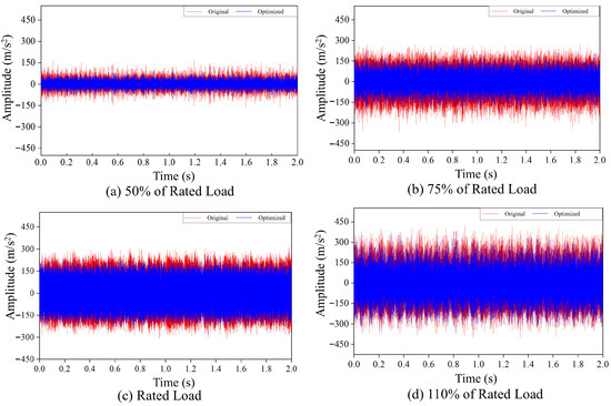 Figure 26 compares vibration signals before and after gear improvement across various load conditions. The consistently lower vibration amplitudes following the improvement indicate enhanced gear performance and substantiate the effectiveness and reliability of the simulation approach.