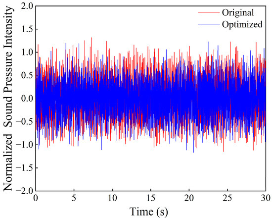 Using MATLAB R2022a, the first 30 s segment of the audio signal was downsampled, filtered, and normalized. The resulting time-domain waveforms of the gear transmission system noise under 110% load, before and after the improvement, are presented in Figure 27. The vertical axis represents the normalized sound pressure level, which reflects the noise intensity in the gear transmission system. As shown in the figure, the noise amplitude is significantly reduced after the improvement, further validating the accuracy of the simulation results and confirming the feasibility of the improved design for the gear transmission system in bauxite mining equipment.