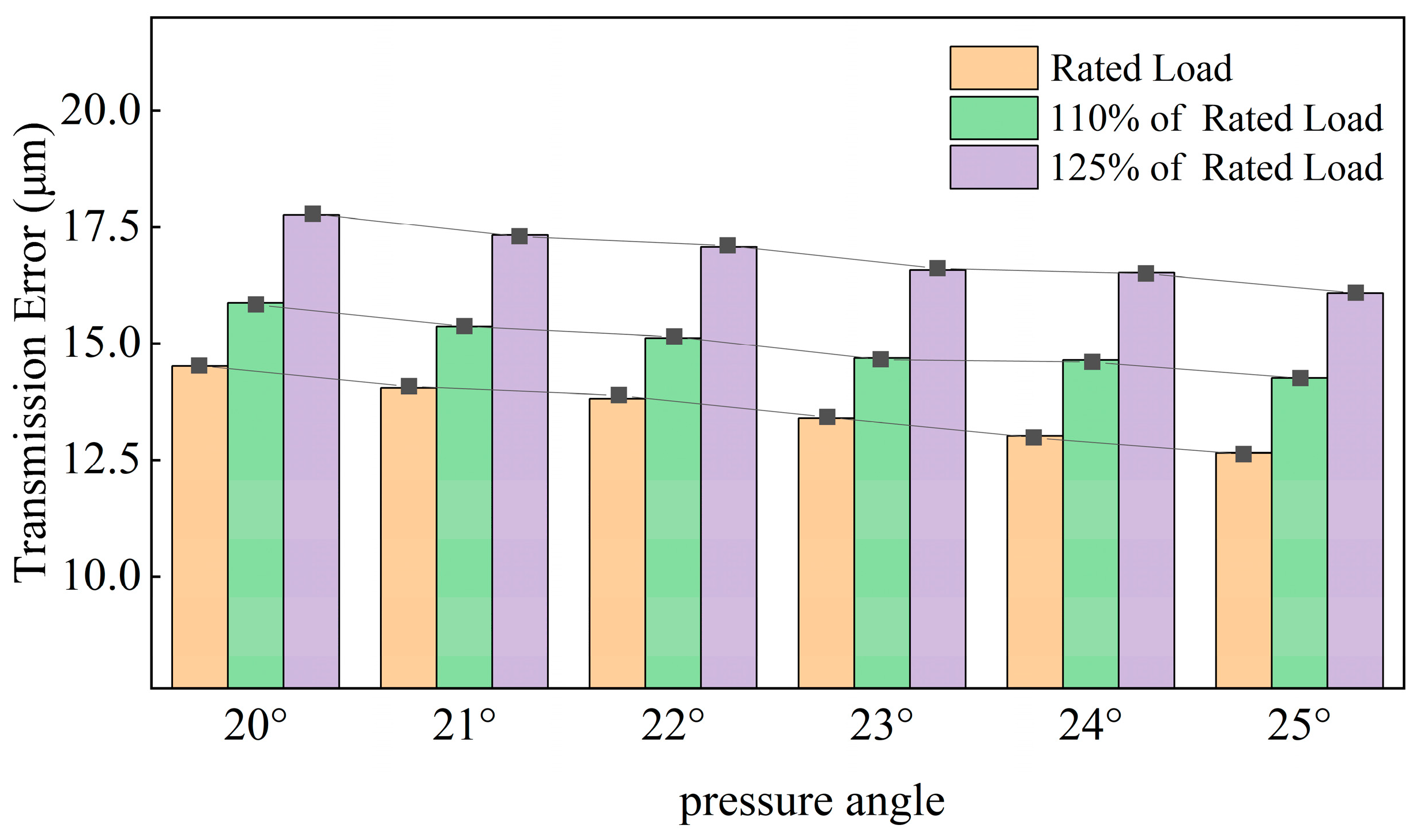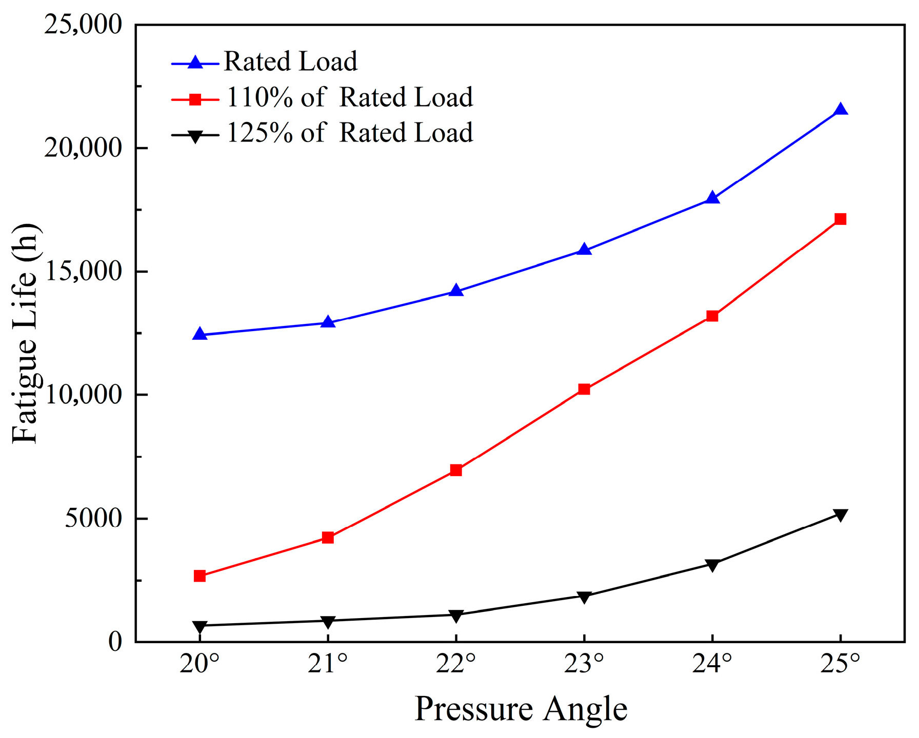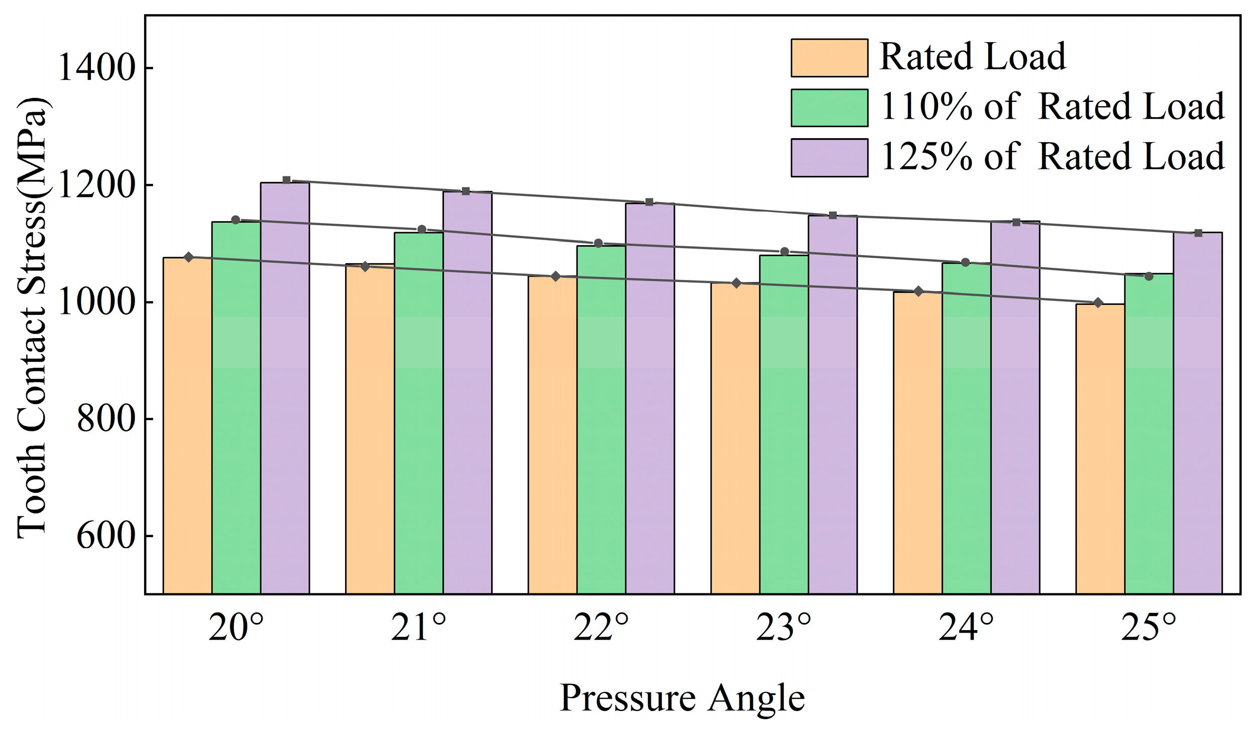 3.1. Influence of Pressure Angle on Gear Meshing Characteristics and Fatigue Life