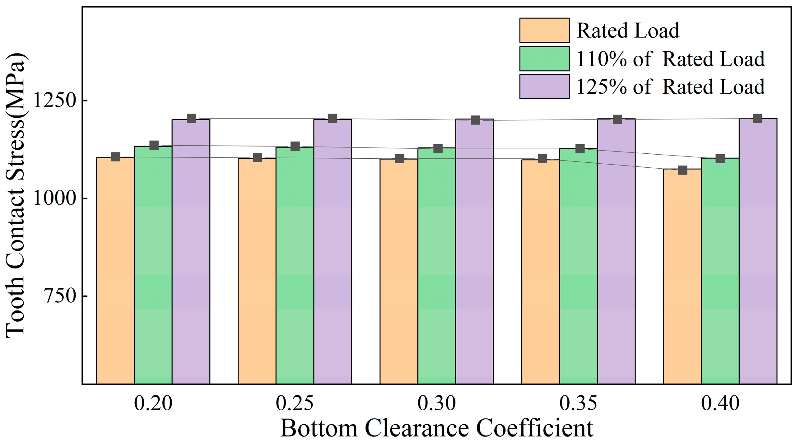 - Increasing the pressure angle significantly enhances gear meshing performance, resulting in reduced tooth contact stress, misalignment, and peak-to-peak transmission error (PPTE) across all operating conditions, along with an improvement in gear fatigue life. Similarly, increasing the face width reduces contact stress and transmission error, thereby extending service life, although it has a negligible influence on misalignment. An optimal bottom clearance coefficient of 0.4 was identified, which effectively lowers contact stress, misalignment, and PPTE under both rated and 110% load conditions, thus improving meshing quality and fatigue life.
