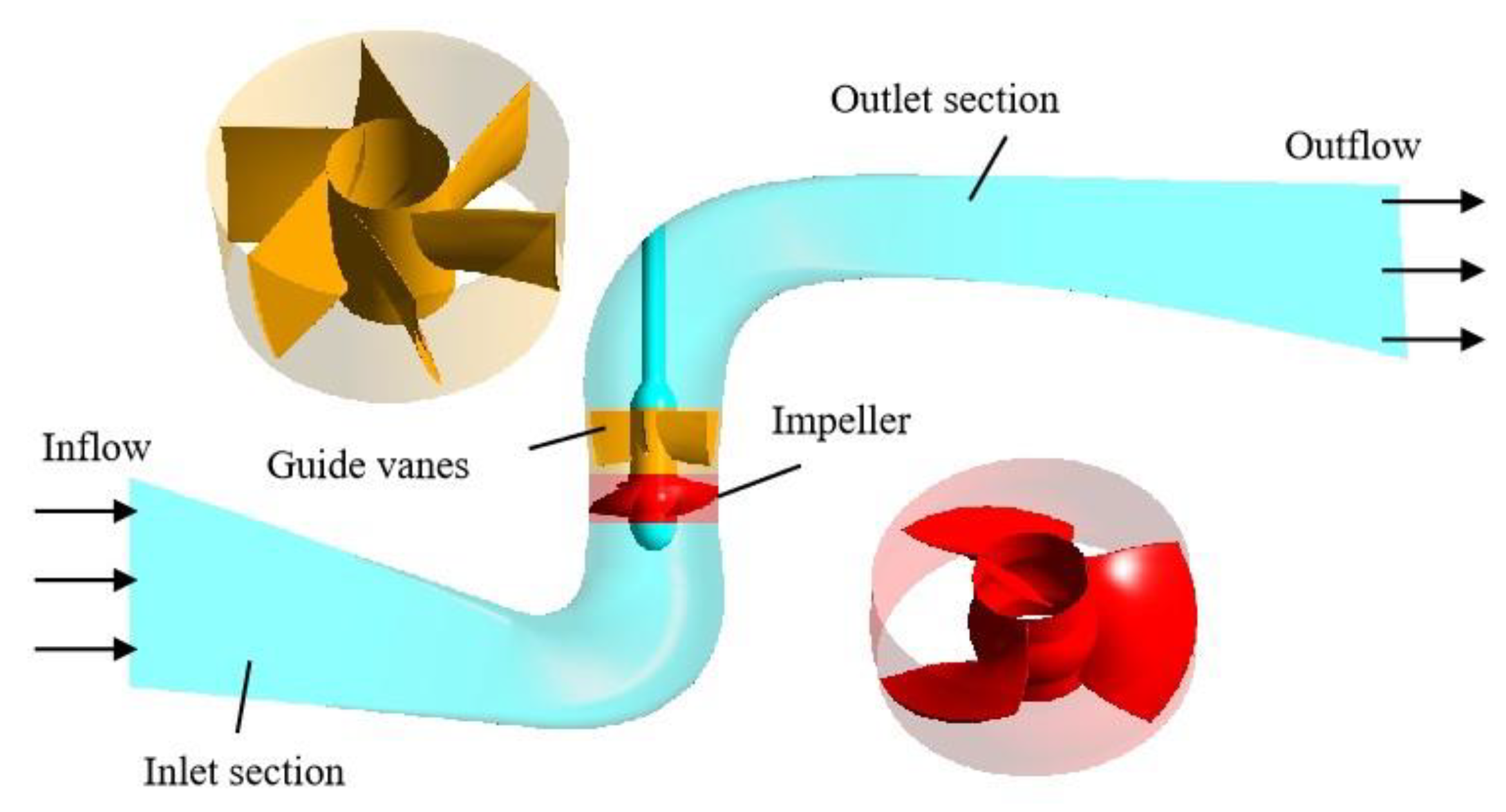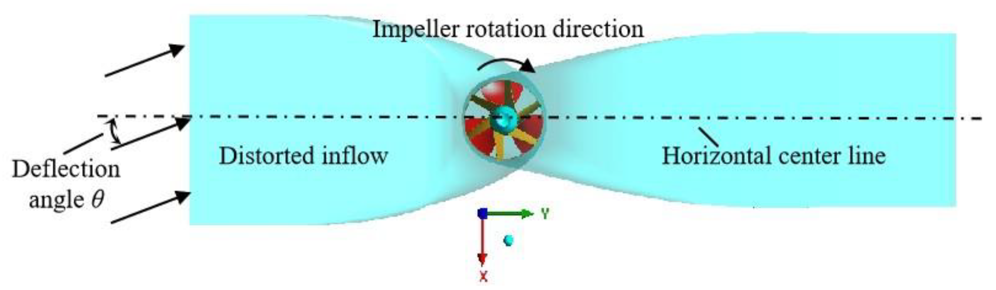 - Kan, K.; Zhang, Q.; Xu, H.; Feng, J.; Song, Z.; Cheng, J.; Binama, M. Investigation of non-uniform inflow effects on impeller forces in axial-flow pumps operating as turbines. Water 2024, 16, 1428. [Google Scholar] [CrossRef]