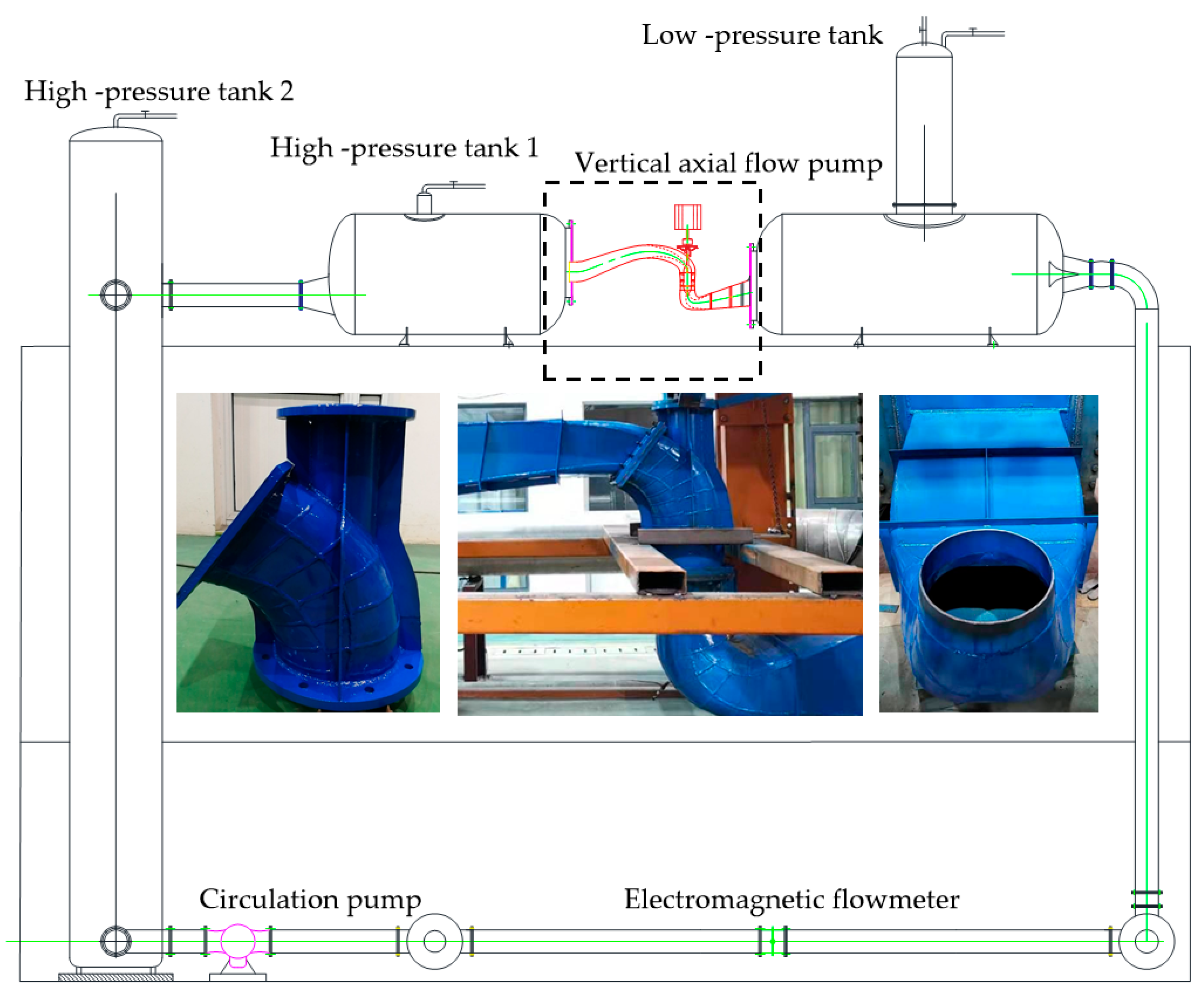 - Jiao, H.; Shan, J.; Yang, G.; Wang, M.; Chen, S. Comparison of the shutdown transitions of the full-flow pump and axial-flow pump. J. Mar. Sci. Eng. 2023, 11, 2129. [Google Scholar] [CrossRef]