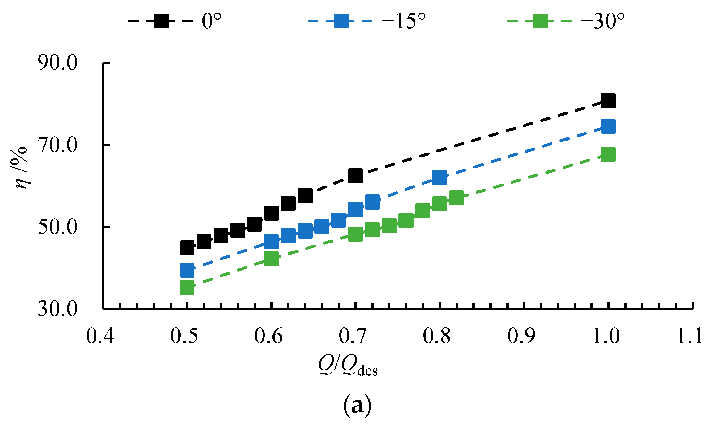 - A decreased deflection angle reduces pump efficiency but increases the head at the same flow rate. Consequently, both critical and deep stall points shift toward higher flow rates, which significantly narrows the pump’s high-efficiency operating range. This trade-off is exemplified by the −30° scheme, which exhibits a 16.27% decrease in design efficiency alongside a 19.59% increase in design head compared to the 0° scheme.