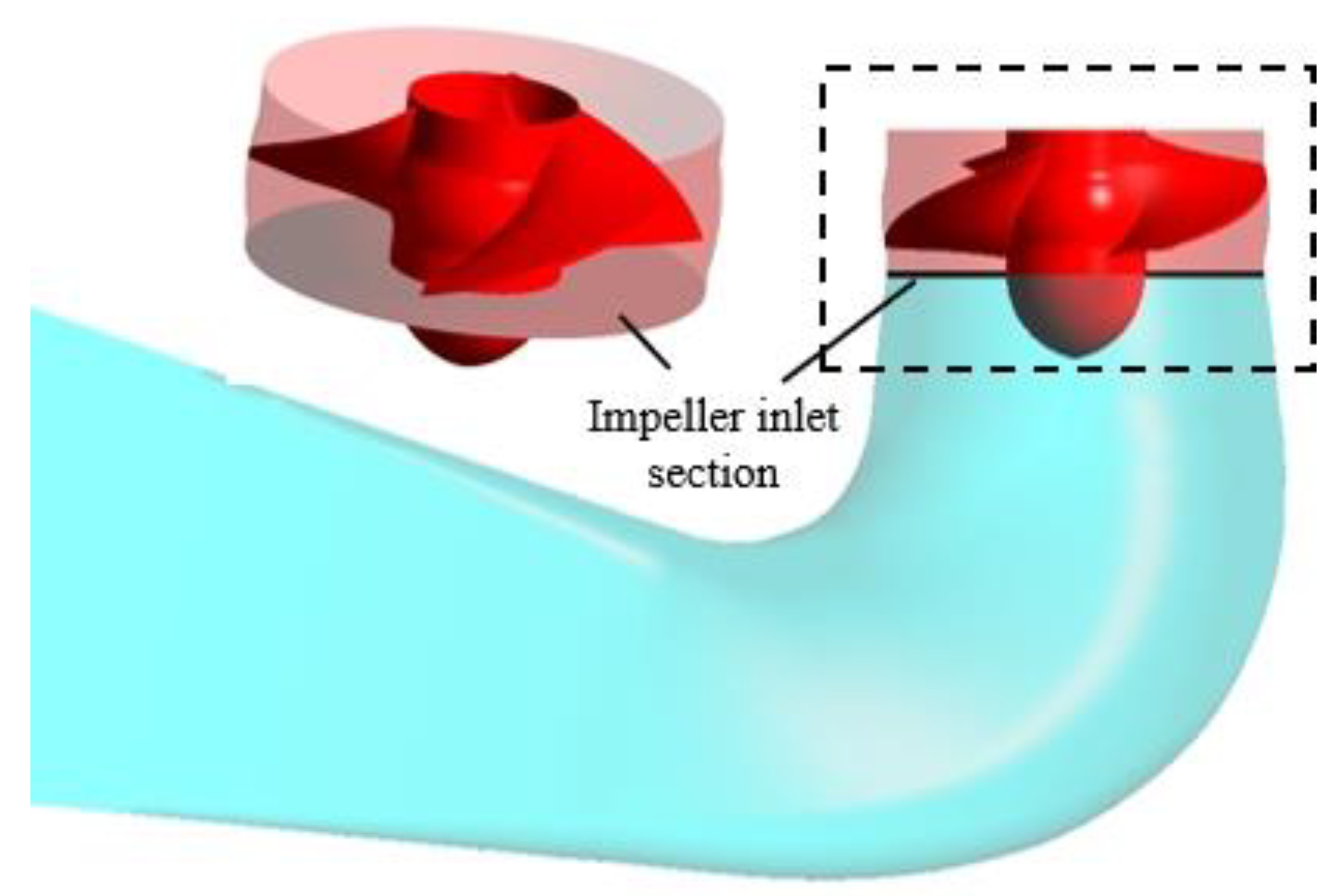 - Yuan, Y.; Fang, Y.; Tang, L. Effects of non-uniform elbow inflow on the unsteady flow and energy development characteristics of a centrifugal pump. Phys. Fluids 2023, 35, 015152. [Google Scholar] [CrossRef]