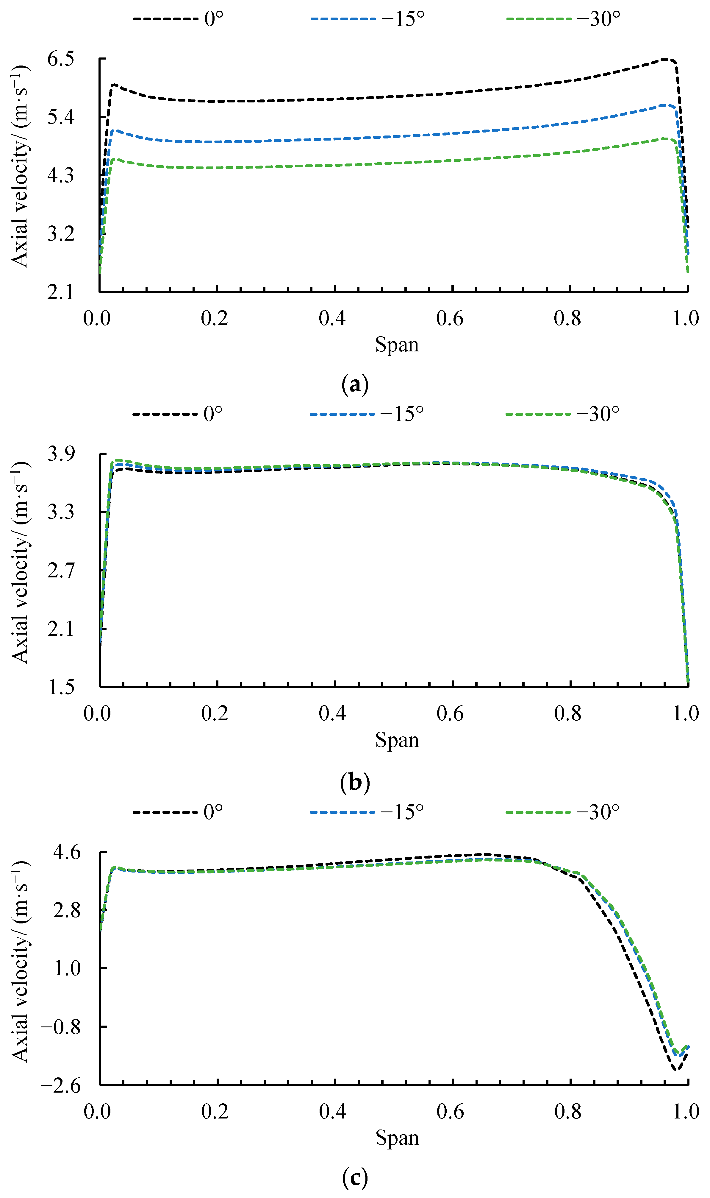 - Compared with the design condition, critical and deep stall conditions induce a circumferentially uniform flow blockage at the impeller inlet. This, in turn, reduces the axial velocity and increases the actual angle of attack. A decreased deflection angle promotes the earlier formation of this blockage at higher flow rates. Quantitatively, under the design condition at spans of 0.02 and 0.96, the axial velocity for the −30° scheme is 23.68% and 23.1% lower, respectively, than that of the 0° scheme.