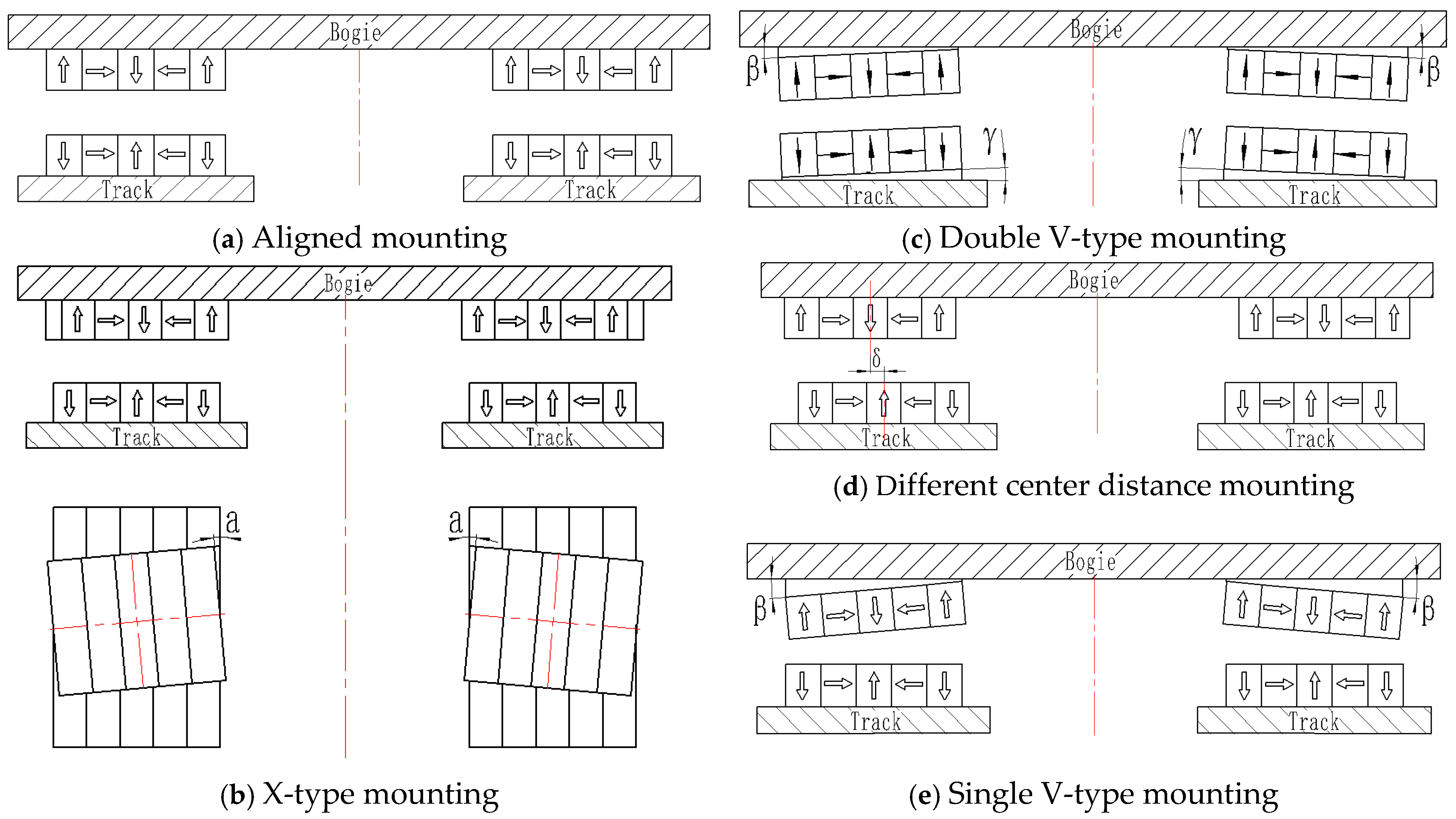 Figure 6, several different mounting types of Magnetic Wheelset are illustrated, including ‘Aligned mounting’, ‘X-type mounting’, ‘different center distances mounting’, ‘Double V-type mounting’, and ‘Single V-type mounting’. When the vehicle-mounted magnet and the permanent magnet track have the same center distance and are installed horizontally, this configuration is referred to as ‘Aligned mounting’. As shown in