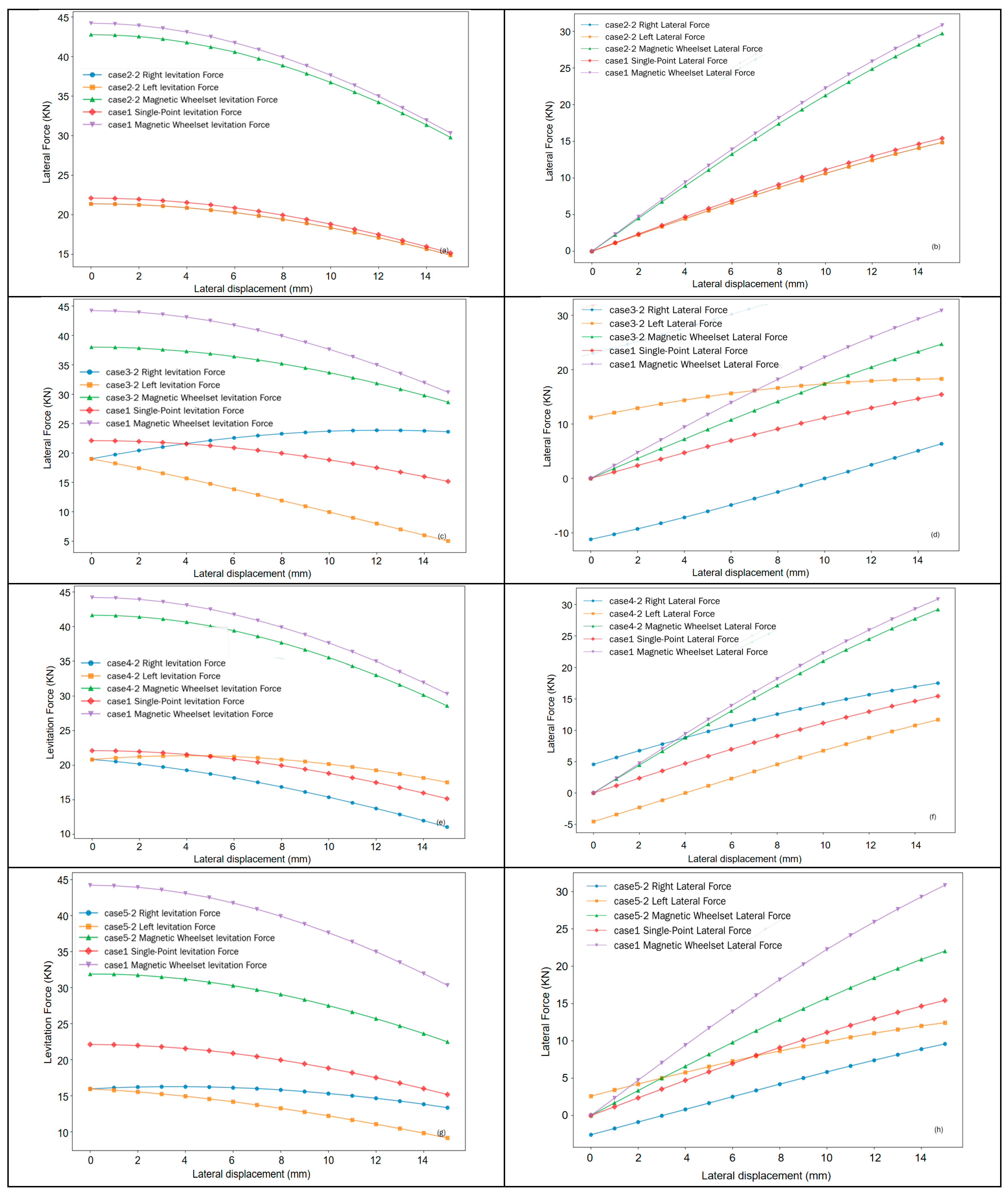 Figure 7e,f, the levitation and lateral forces of the Magnetic Wheelset formed by the left and right points under Case 4-2 and Case 1 are presented. The results indicate that under the mounting type of Case 4, the levitation and lateral forces differ between the left and right points. At zero lateral displacement, the levitation forces on both sides are equal. The lateral forces are equal in magnitude but opposite in direction, resulting in a net lateral force of zero for the Magnetic Wheelset.