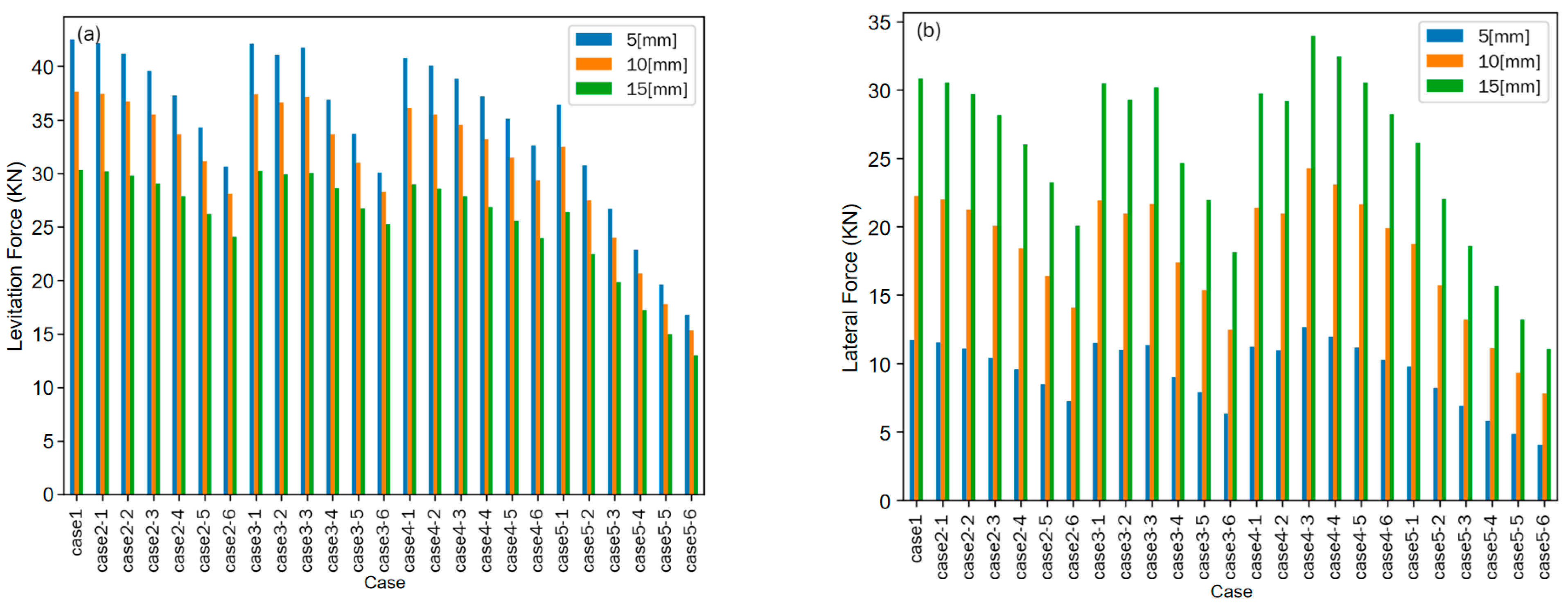 Figure 8 presents the levitation and lateral forces for all cases at a levitation height of 15 mm under lateral displacements of 5 mm, 10 mm, and 15 mm. As shown in