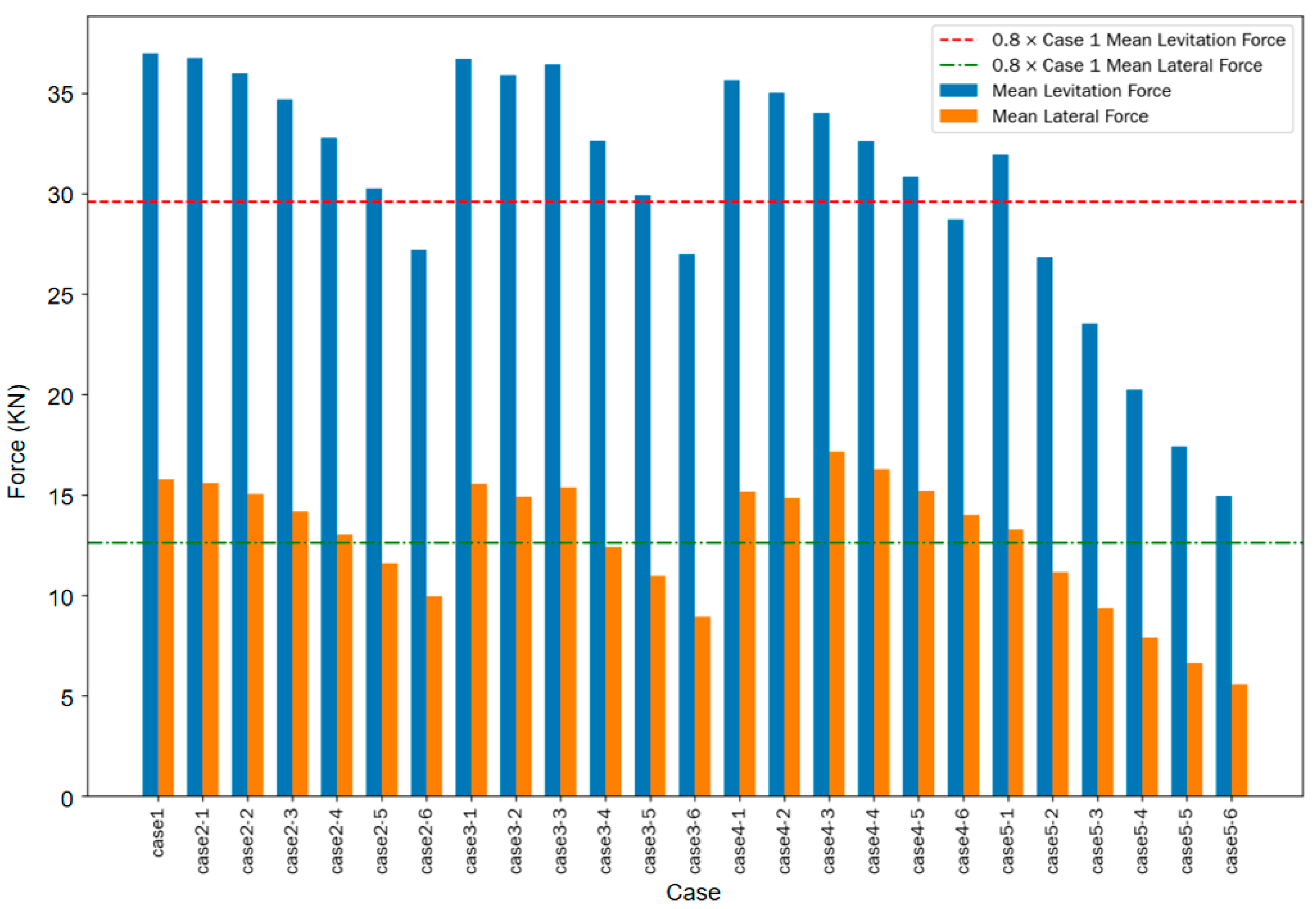While the CV serves as a dimensionless stability indicator that reflects the amplitude of data fluctuation, it does not convey the absolute magnitude of the data. As the preceding analysis has shown, all other cases result in a reduction in both levitation and lateral forces compared to Case 1. Therefore, it is necessary to establish a mean force threshold for all cases to prevent an excessive decrease in levitation force or an insufficient reduction in lateral force. Based on the actual operational data of the Xing guo Line, a 20% reduction from the levitation force in Case 1 still meets the safety requirements for the levitation gap. Accordingly, using the mean levitation and lateral forces of Case 1 as benchmarks, the mean levitation force under any case must be no less than 0.8 times