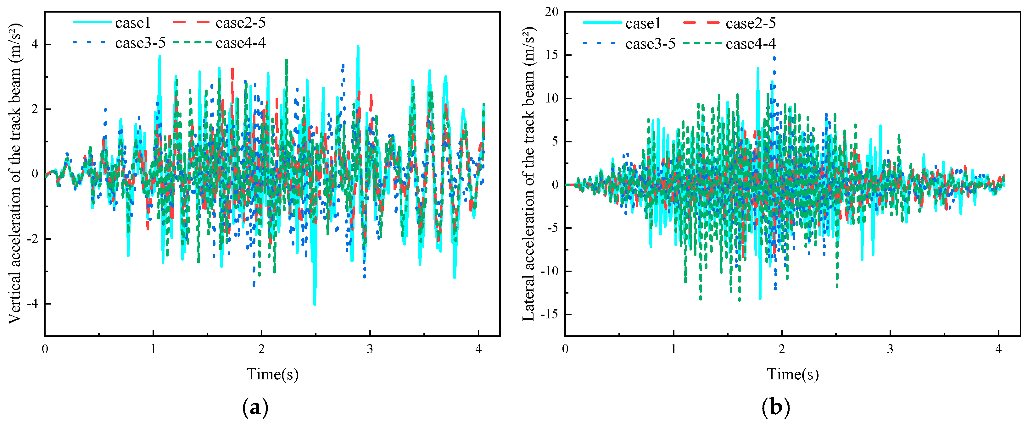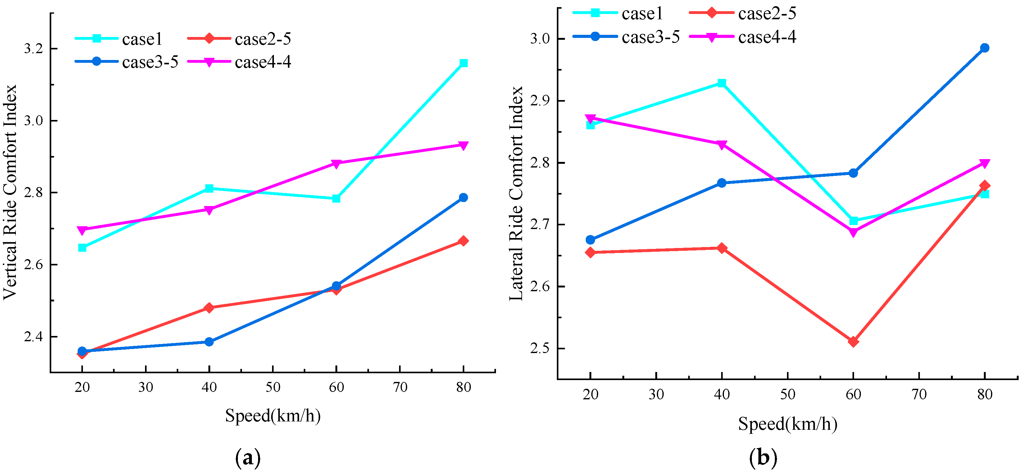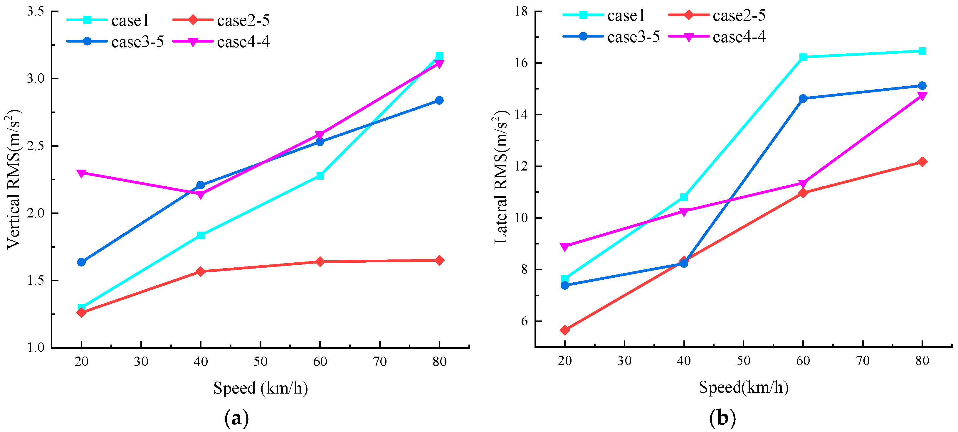 Figure 7a,b, the levitation forces and lateral forces corresponding to the Magnetic Wheelset under Case 2-2 and Case 1 are presented. It can be observed that under Case 2, the levitation and lateral forces of the left and right individual points of the Magnetic Wheelset are identical. Compared with Case 1, the variation trends of both the levitation and lateral forces remain similar, but their magnitudes decrease.