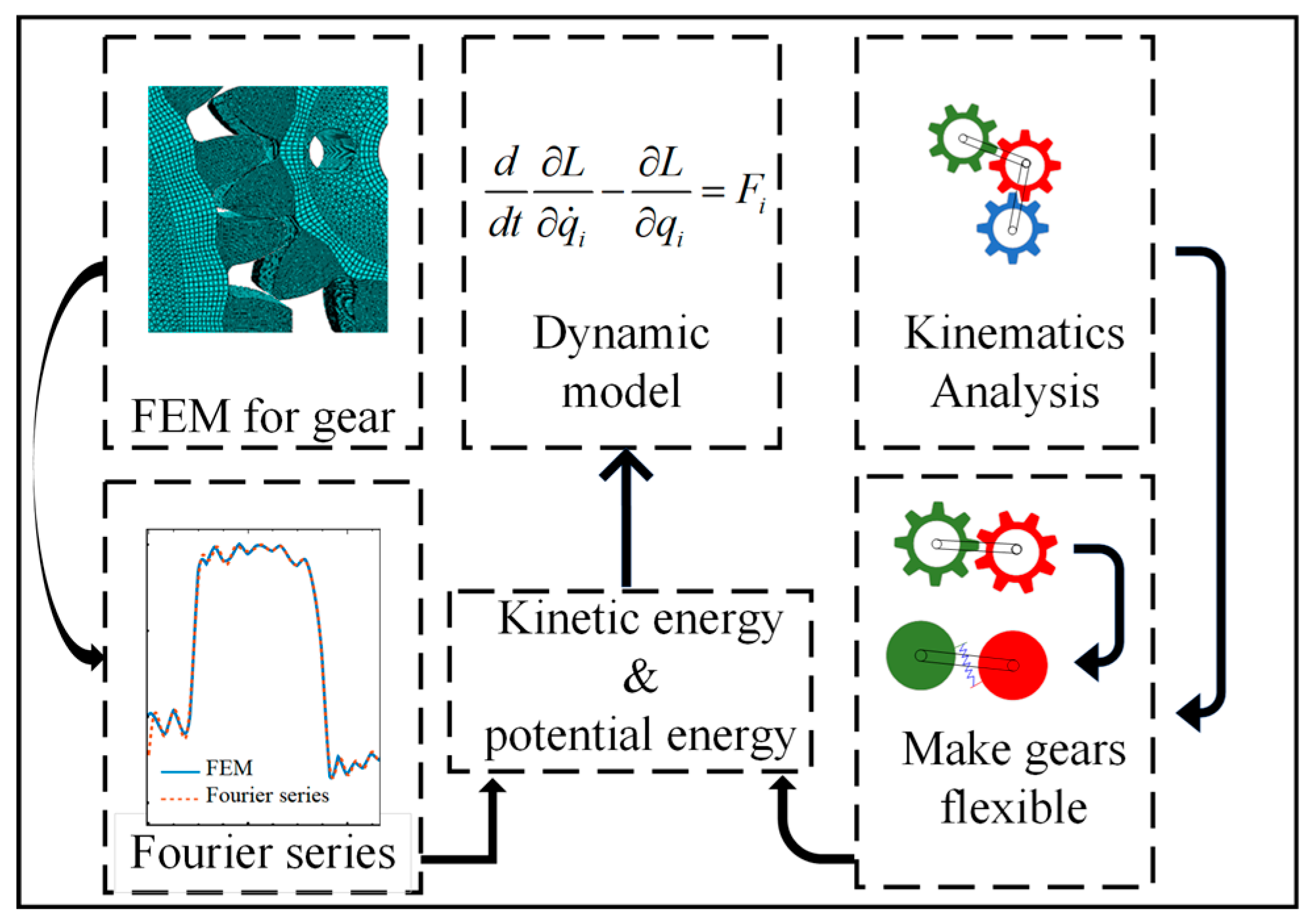 - A hybrid dynamic modeling framework for gear-linkage mechanisms: We develop a novel dynamic modeling approach that integrates finite element analysis, Fourier series, and Lagrangian dynamics. This framework explicitly incorporates the time-varying gear mesh stiffness—a critical factor often neglected in traditional models—through a feature decomposition process. It successfully bridges the gap between the prohibitive computational complexity of full-system FEM models and the oversimplification of traditional models, achieving high accuracy with a minimal number of degrees of freedom. We present the complete design and stability analysis of a single-degree-of-freedom gear-five-bar mechanism, offering a theoretical and practical solution for clinical rehabilitation.